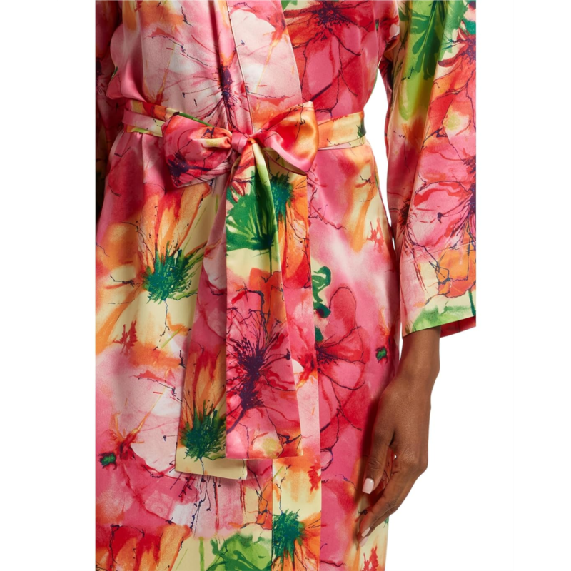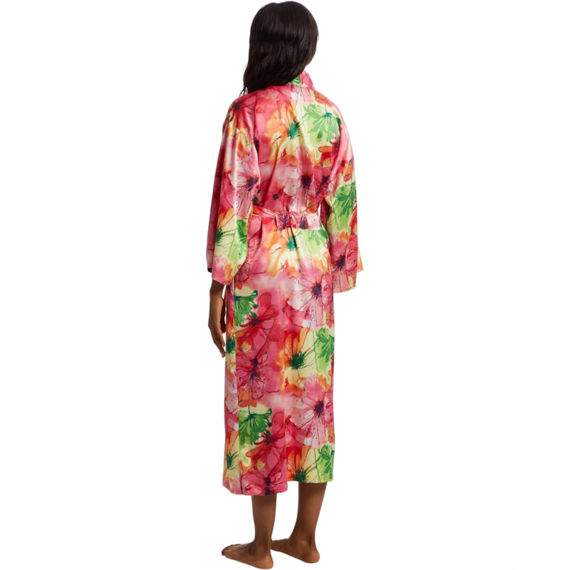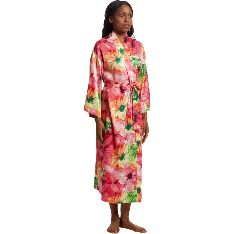 - Indulge in grace wearing the N by Natori Radiance Satin Robe. Made with spandex for added comfort and elasticity, featuring shawl collar neckline, open front silhouette, self tie detailing on the waist, long sleeves, straight hem, and allover floral print.