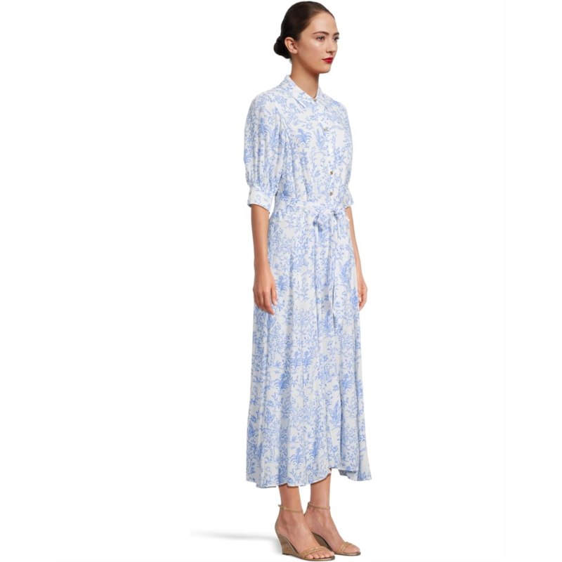 - The Lilly Pulitzer Larkyn Midi Shirtdress is a fit-and-flare dress with a full button front placket, elbow-length sleeves with tall cuffs, godets at the skirt, and a separate sash. Featuring an allover floral print, this midi dress is styled with a ribbon detail at the waist and a collared neckline.