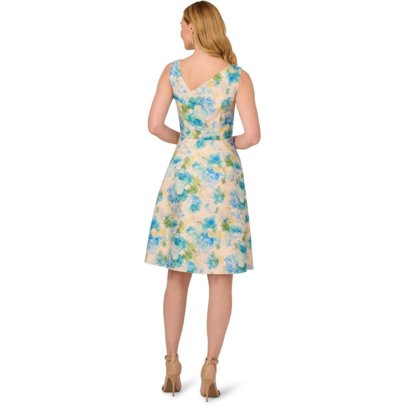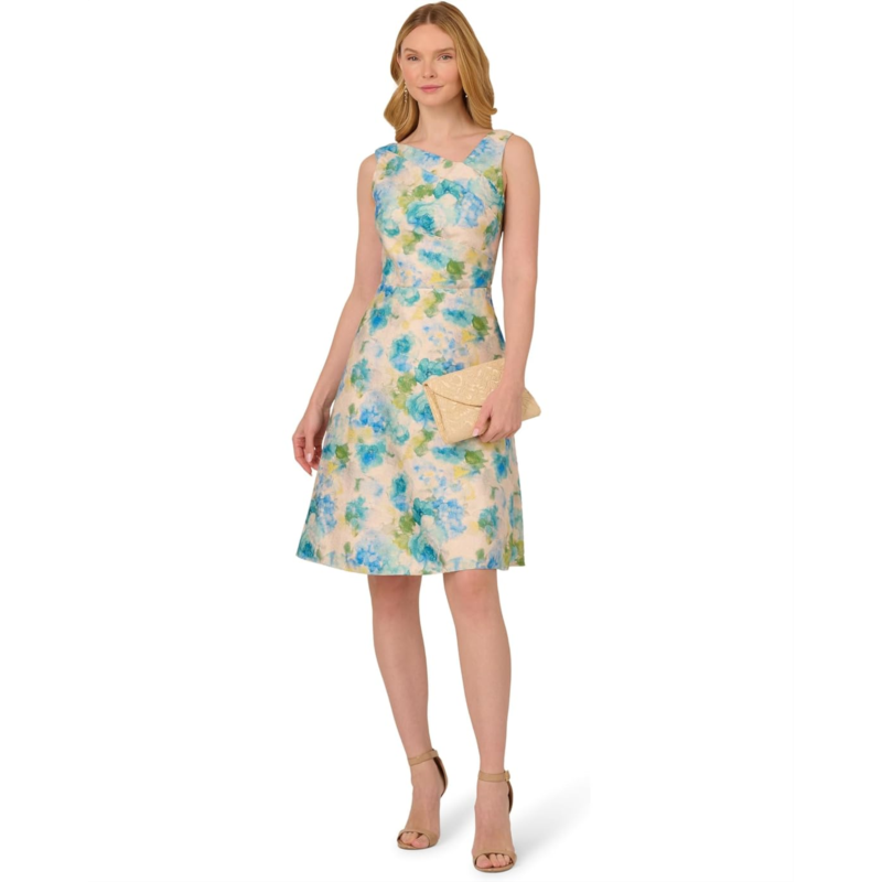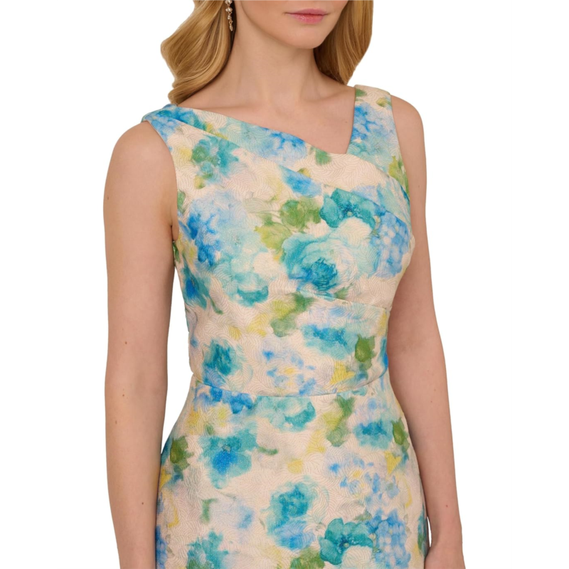 - Flowy, feminine, fabulous, the Adrianna Papell Asymmetrical Jacquard Midi Dress is a perfect brunch dress. This dress features asymmetric neckline, sleeveless style, blouson silhouette, and zippered back closure.