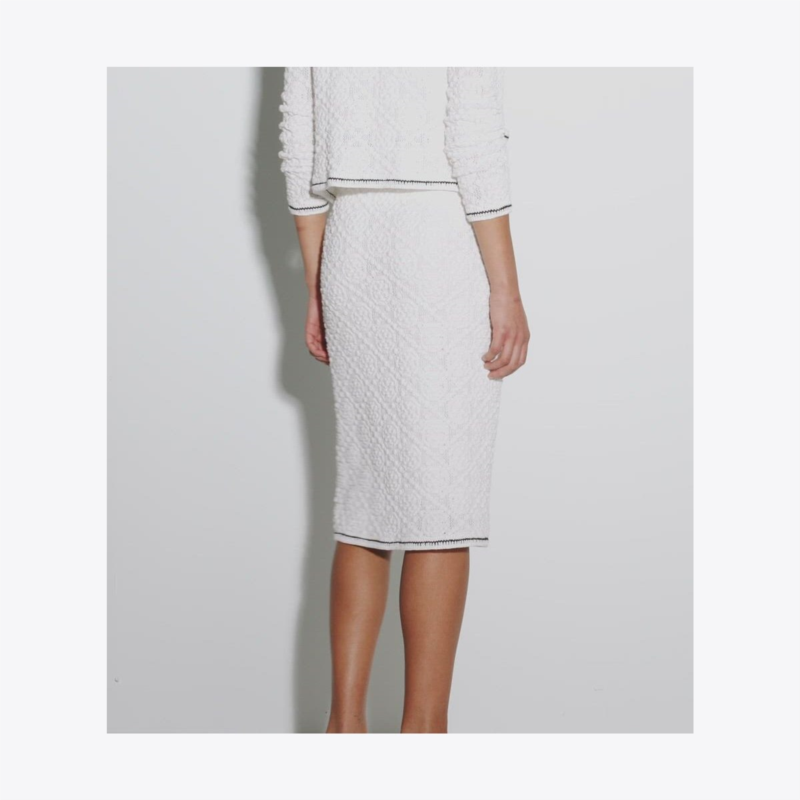 - Crochet detail at neckline, placket, sleeve cuffs, pockets, and hem