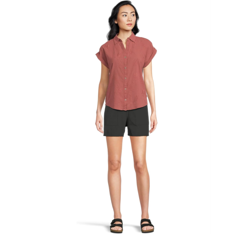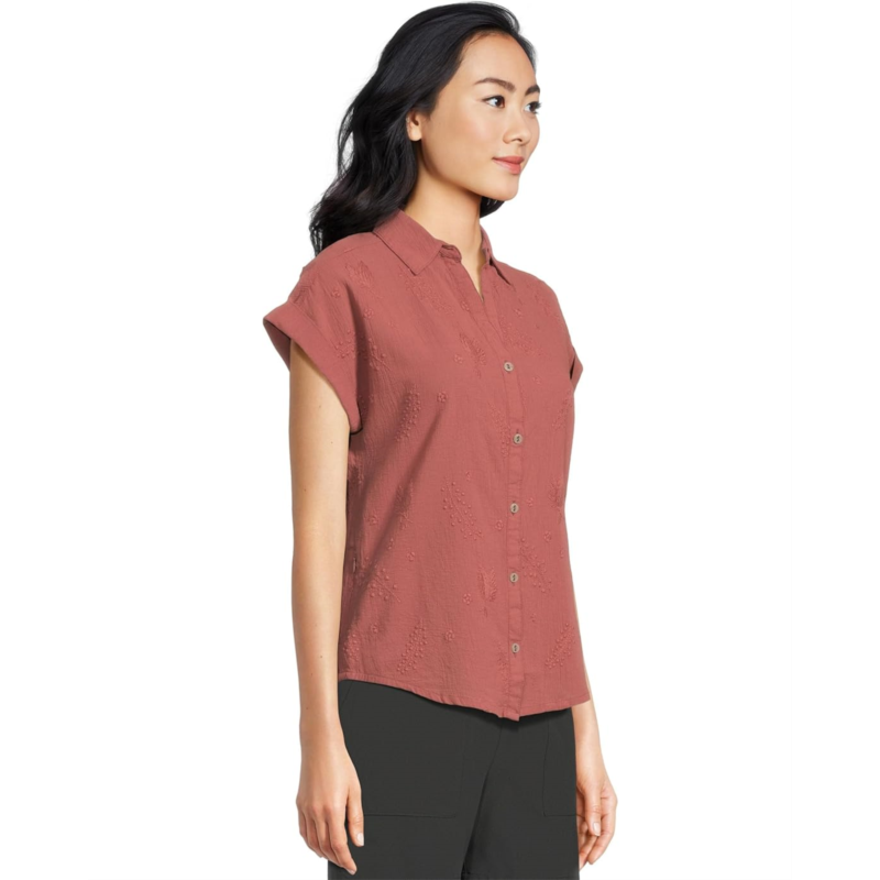 - The Royal Robbins Oasis Short Sleeve shirt is perfect for days at base camp and everyday adventures. Its lightweight, airy cotton fabric is responsibly farmed using lower-impact practices than conventional cotton farming and is naturally soft, breathable, and durable. The buttoned front closure ensures easy wear. This button-down shirt is designed with short sleeves, a collared neckline, and a shirttail hem. Its floral embroidery details add to its style.