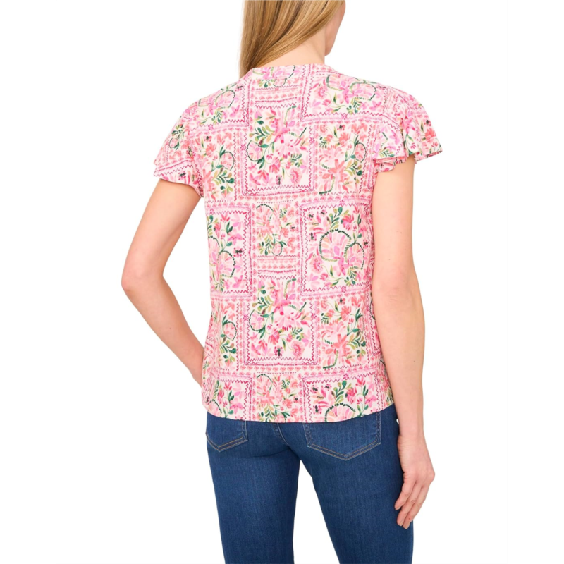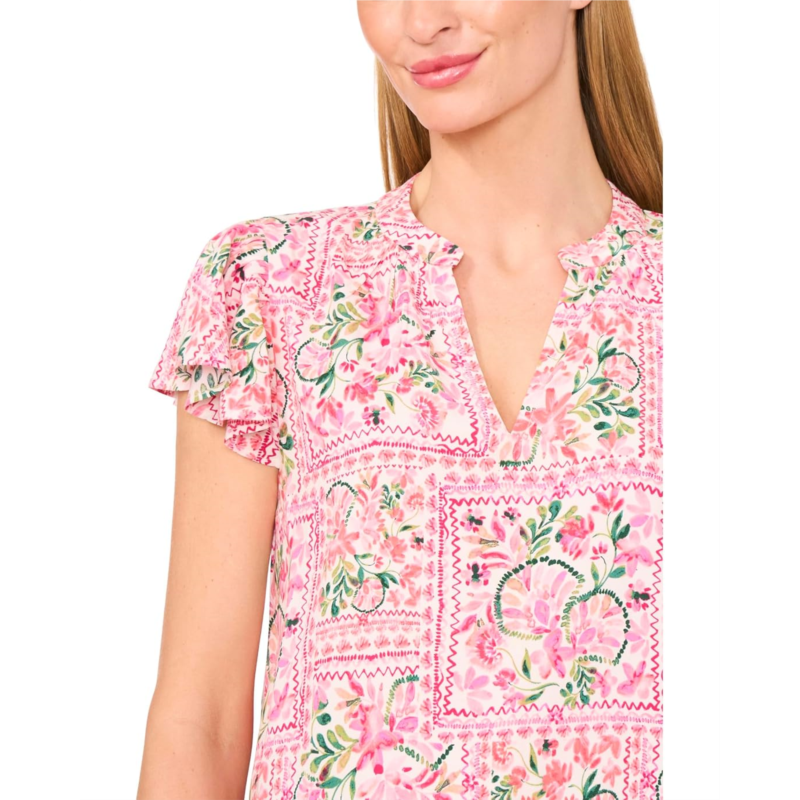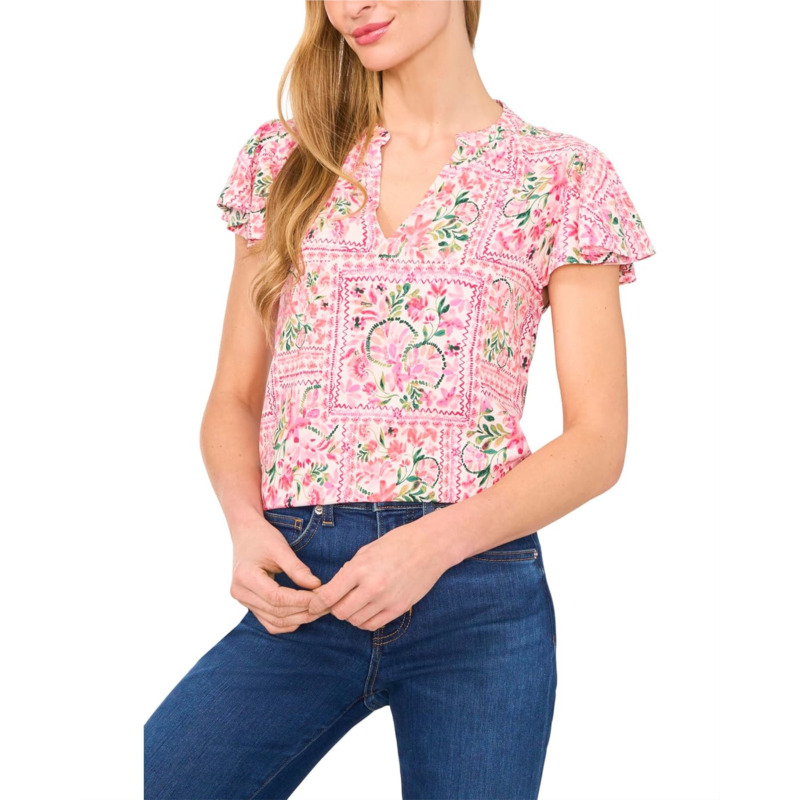 - Level up your look wearing the CeCe V-Neck Shirred Flutter Sleeve Blouse with an allover floral print. The V-neck blouse features a shirred front neckline and delicate short flutter sleeves, creating a soft, elegant silhouette. With its lightweight fabric and flattering embroidered details, it''s the perfect blend of comfort and style for both casual and dressier occasions