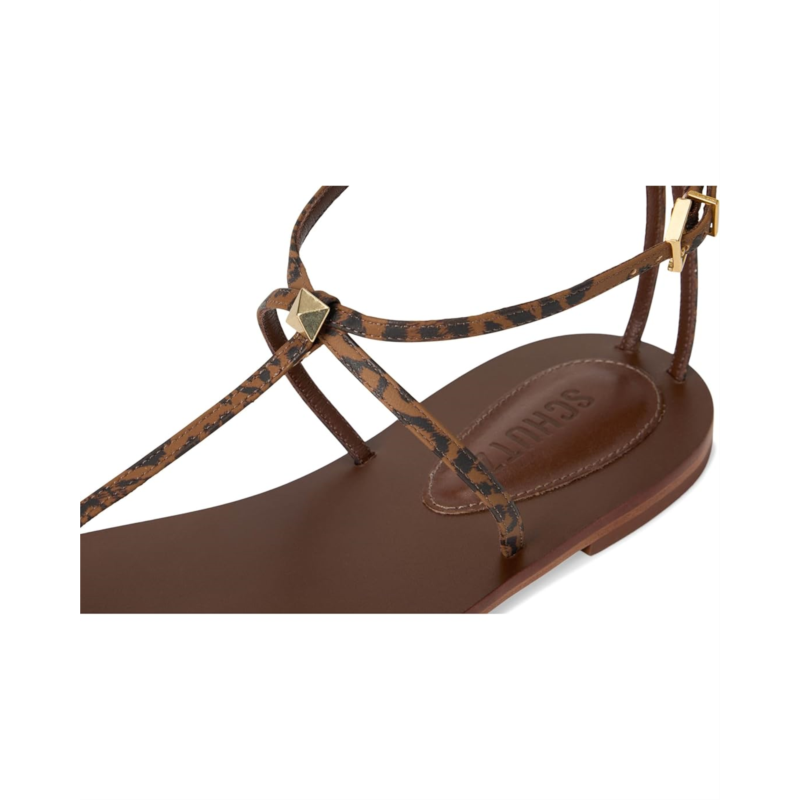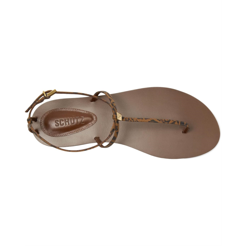 - Designed for style and comfort, the Schutz Ester boasts high-quality leather upper straps. This flat sandal features thin, delicate strips that create a chic and sophisticated look. The toe post and buckle adjustable ankle strap ensure a secure fit, while the open almond toe adds a touch of modern flair.
