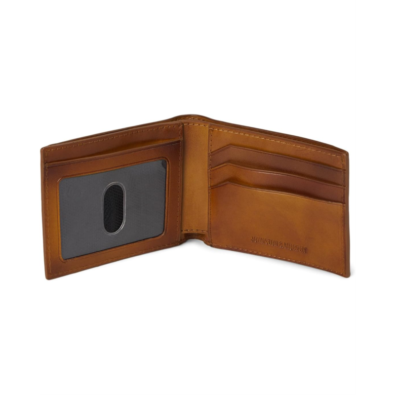- Timeless elegance meets modern security carrying the Johnston & Murphy Hudson Burnished Billfold Wallet. Crafted from premium leather, this classic billfold combines sophistication and functionality. Designed with a flap closure, it features three card slots, a currency pocket, and a convenient thumb-slide ID window for easy access. The RFID-blocking shield ensures your personal data stays secure, while the lined interior adds a touch of refinement.