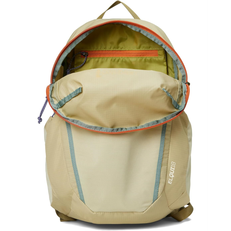 - Compact yet feature-filled, the Cotopaxi Elqui 18 L Backpack makes getting out on the trail easy. A large stretch stuff pocket on the front of the pack makes it easy to stash a jacket (or sandals), while the EVA foam, mesh back panel, and removable waist belt provide all-day comfort and breathability. Stash your phone in the quick-access strap pockets and stay hydrated with the built-in bladder sleeve. Made from nylon fabric, this laptop backpack also comes with breathable shoulder straps, a back panel, and an adjustable & removable sternum strap. Its side compression offers added comfort. This daypack backpack is designed with dual water bottle pockets, a stretch mesh dump pocket, a zippered main compartment, and zippered interior pockets.