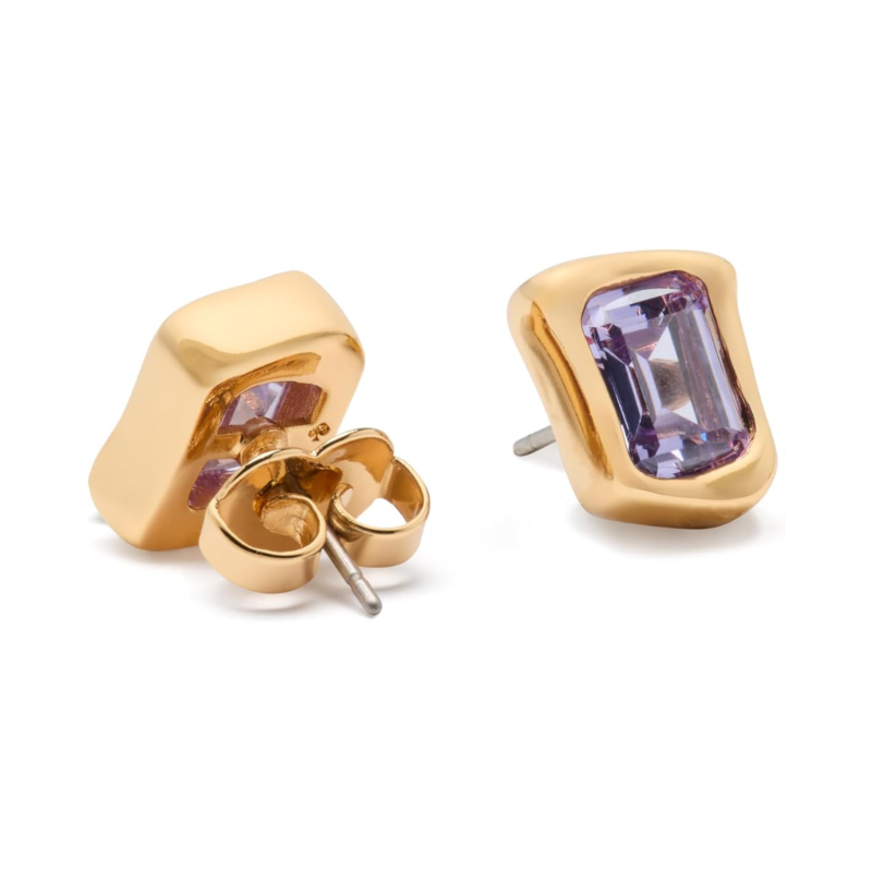 - Shine bright donning these captivating Kate Spade New York Molten Glass Studs. Crafted with radiant brass and shimmering cubic zirconia material and features post-back closure for a secure, comfortable fit.