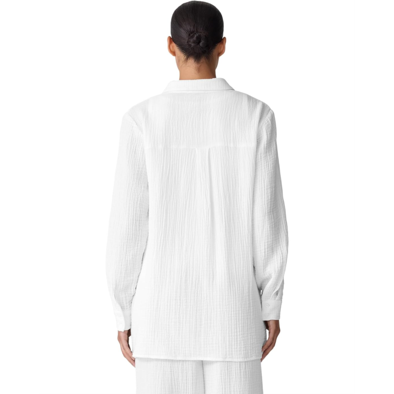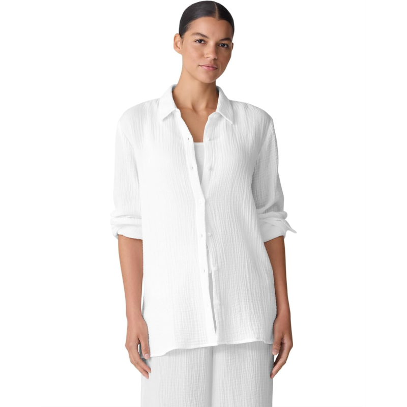 - Meet the Eileen Fisher Classic Collar Shirt-your new go-to for effortless elegance. Designed with a crisp collared neck and long sleeves, this beauty boasts a button front closure that keeps things classic yet current. But it''s the fabric that truly steals the show-woven with pockets of air and crafted from two gauzy layers, it creates a rippled texture that feels like a breath of fresh air against your skin. Light as a whisper and tailored to perfection, it blends structure and softness in a silhouette that moves with you.