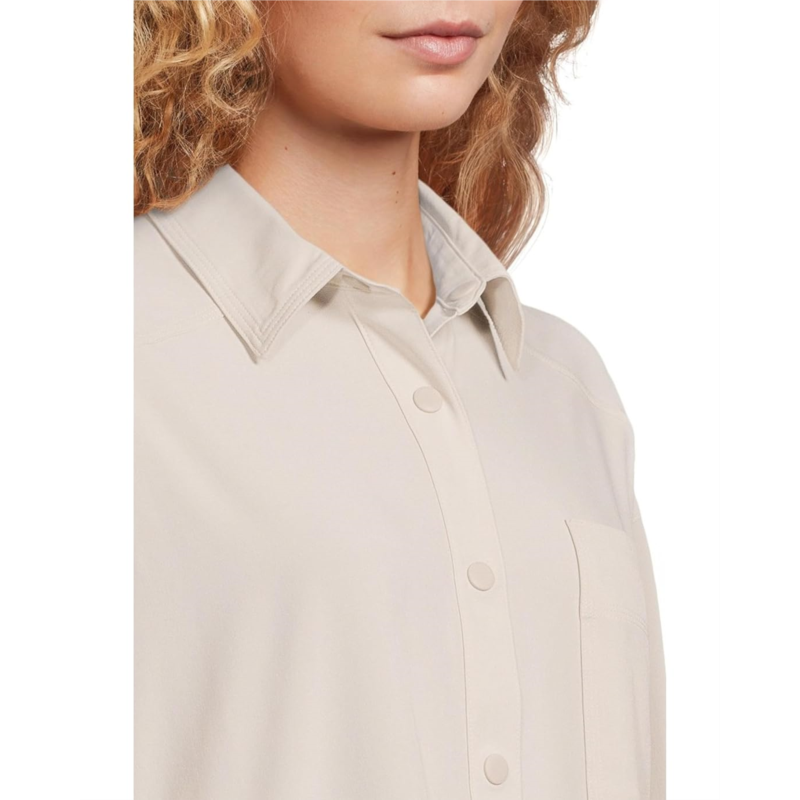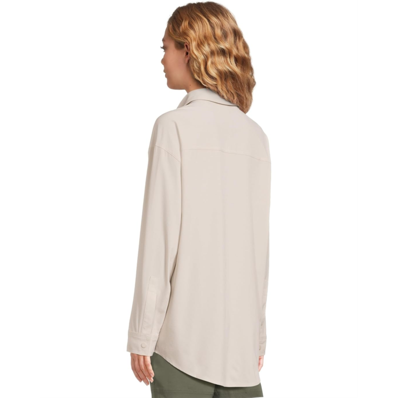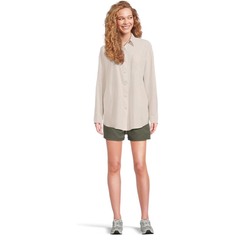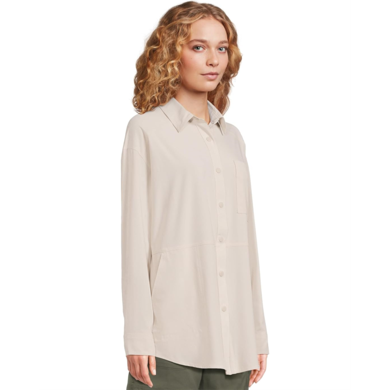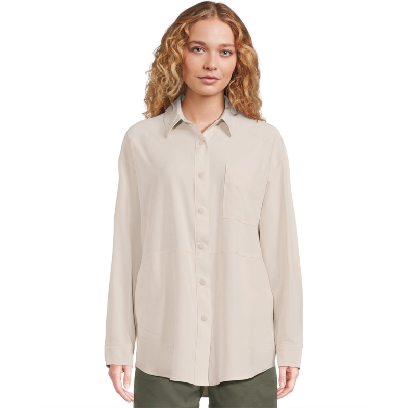 - An effortless addition to your wardrobe, the Prana Railay Oversized Button Down Shirt features a collared neck and a button-front closure. The patch pocket on the chest and two slash hand pockets at the waist allow easy storage. The look is completed with long sleeves with buttoned cuffs and a shirttail hem. The triple needle stitching prAna logo label at the back pocket adds an authentic touch, while the UPF 50+ fabric keeps you protected from harsh sun rays.