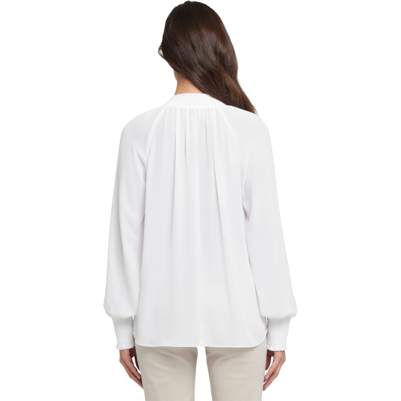 - Romance your jeans with the NYDJ Gemma Blouse. Featuring a breezy silhouette, a split neckline with ties and long raglan sleeves. Stretch smocking details the collar and cuffs. It is finished with a flattering curved hem.