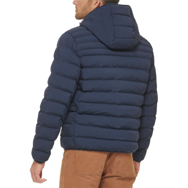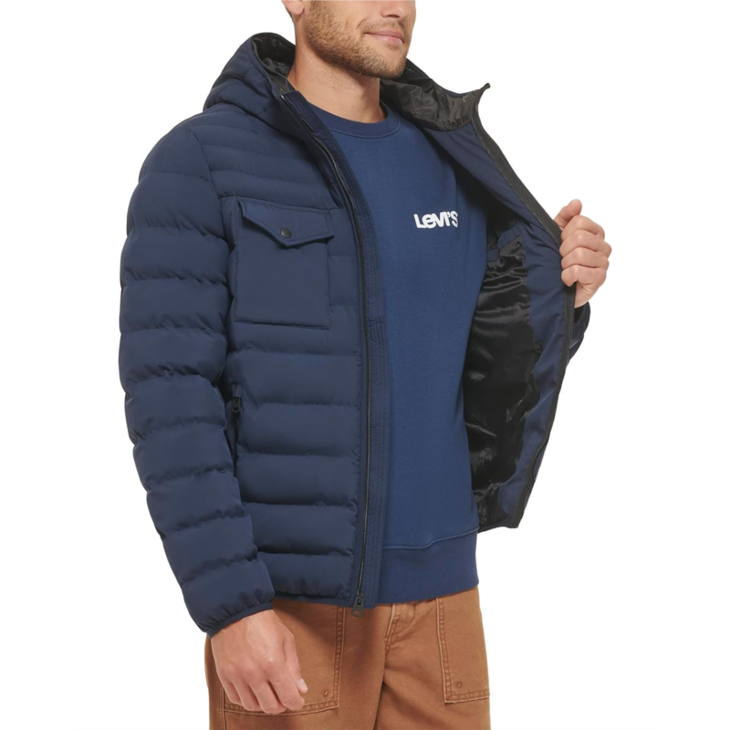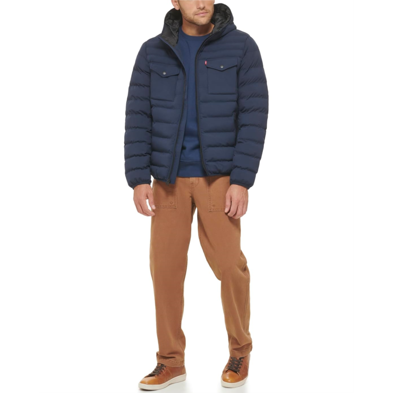 - Beat the winter chills in full style and cozy comfort wearing Levi''s Stretch Two-Pocket Quilted Jacket. The jacket is crafted with a stretch quality for superior motion, hooded construction, long sleeves, two buttoned flap pockets on the chest, and binded cuffs & hem.