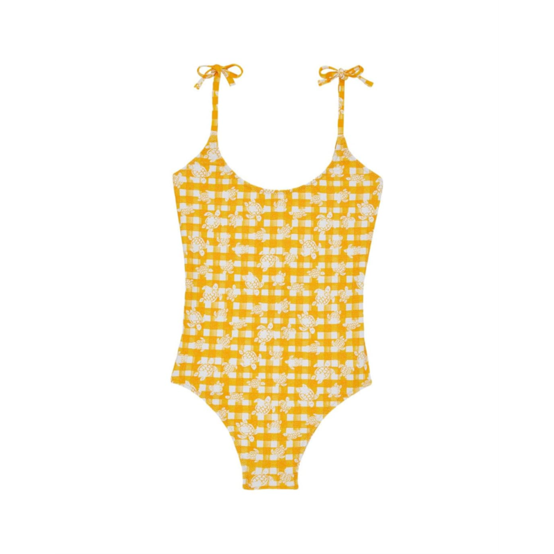 - Shimmer, shine, and make a splash wearing the Vilebrequin Kids Delizia Ronde Des Tortues Vichy one-piece swimsuit is a dazzling blend of elegance and playfulness. Designed with a stunning tortoise-print pattern and a touch of glamorous metallic shine, this sleeveless beauty is crafted from ultra-stretchy fabric for a perfect fit. The adjustable tie shoulders ensure all-day comfort, while the chic low-back silhouette is finished with the iconic Vilebrequin logo for a signature touch. A pull-on design makes it effortlessly stylish and easy to wear-ideal for beach days, poolside adventures, and sun-soaked fun.