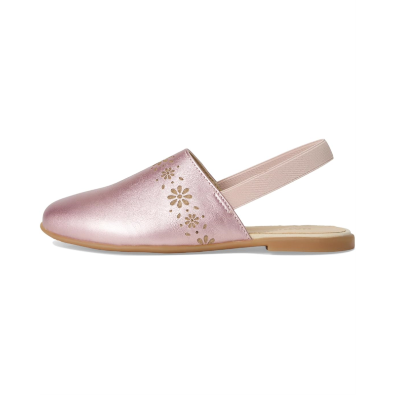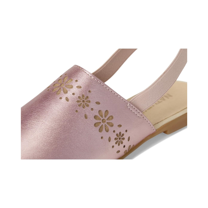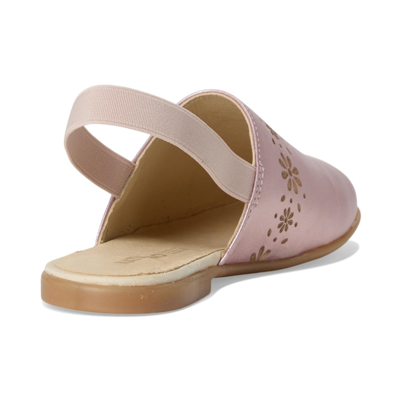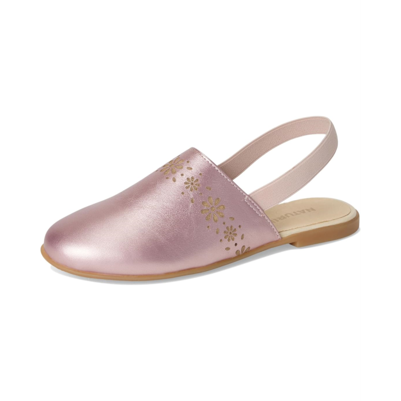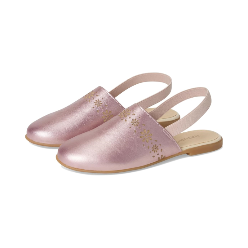The Naturino Callais sandals are slingback mules with flower detail. They are made of a leather upper, insole, and lining. The slingback strap offers added support.