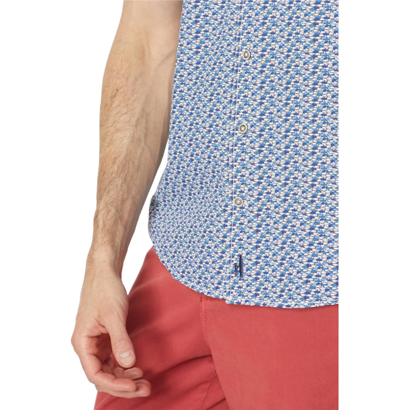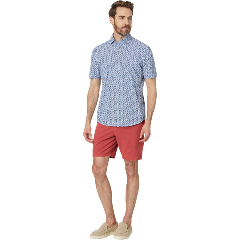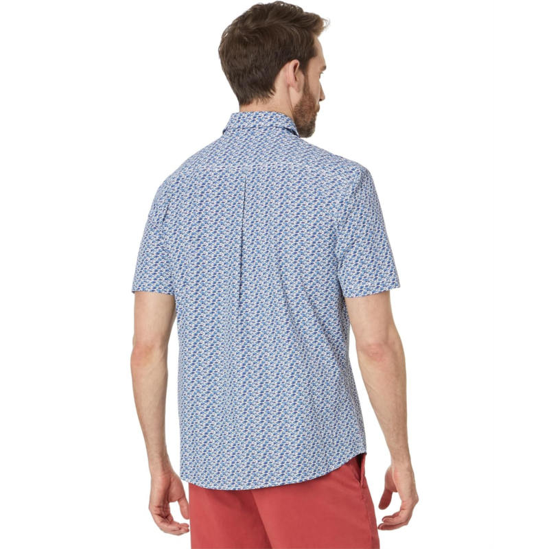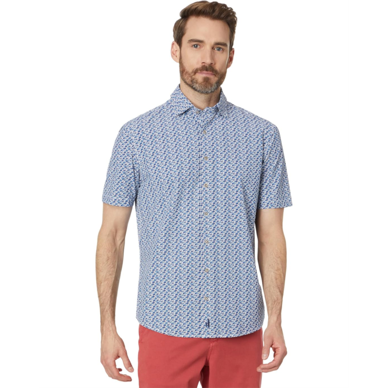 - Tailored for success, the johnnie-O Bento is crafted for confidence. This printed jersey knit shirt features spread collar neckline, short sleeves, button down front closure, tonal embroidered logo on bottom tail and tweener button. This regular fit shirt comes with curved hem.