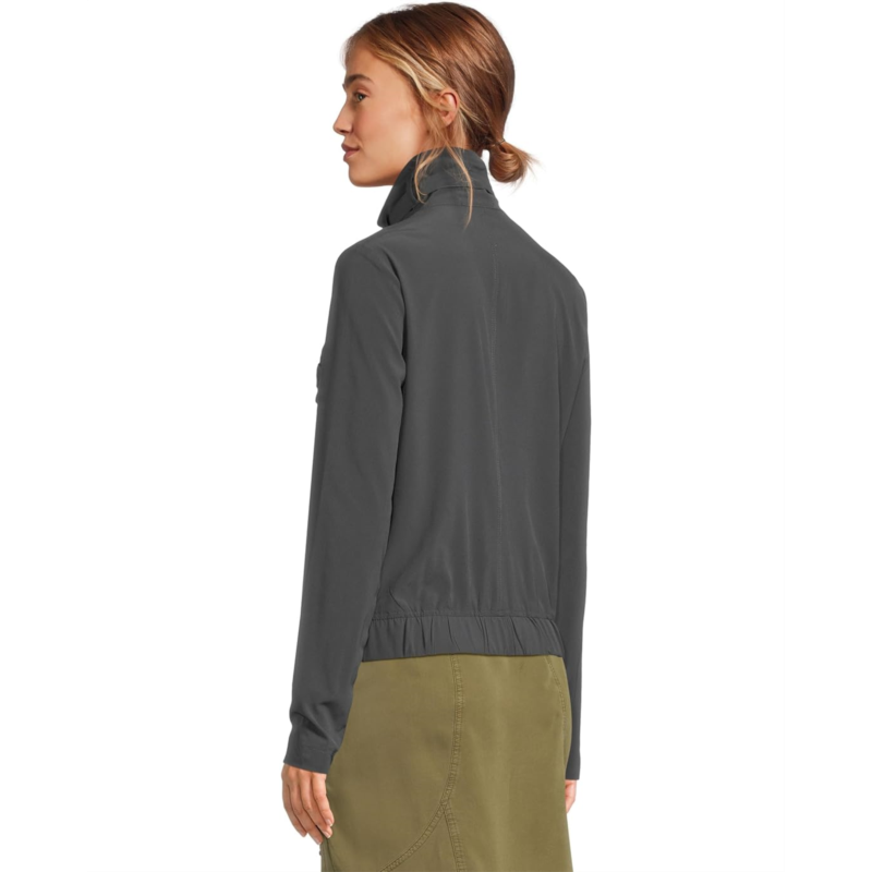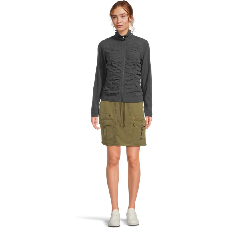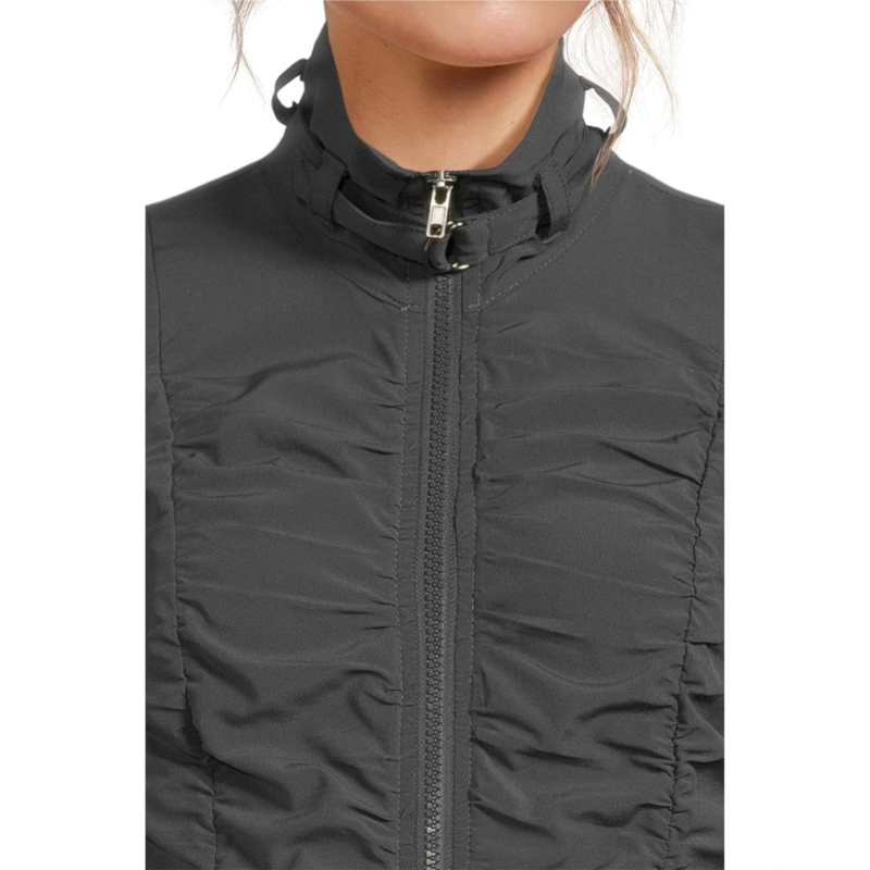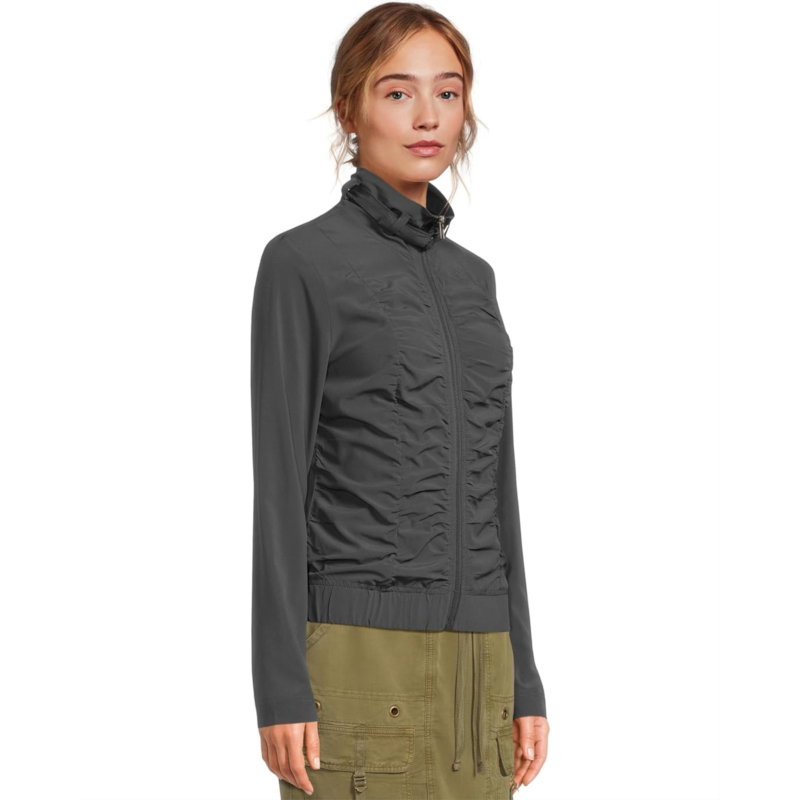 - Maximum performance meets the XCVI Momentum Jacket in flexible Whisper four-way stretch fabric, designed for sweat-resistant movement and easy comfort. It features allover ruching on the front, an elastic cinched hemline, and a belted buckle detail at the collar for some added chic. The zippered front closure offers easy wear. This zip-up jacket is styled with long sleeves and a collared neckline. Activewear never looks so stylish, wear this jacket for movement or style with a casual bottom for sartorial excellence.