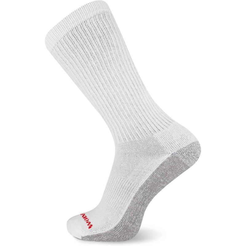 Stay comfortable during your work day with the Wolverine Men''s Cotton Steel Toe Crew Socks 6-Pack. The 46% cotton, 36% polyester, 17% nylon and 1% spandex construction offers a soft and stretchy feel all day, and the embroidered WOLVERINE logo across the top displays your brand pride. The ribbed stay-up top ensures a snug fit, and the smooth toe seems provide comfortable wearing. 46% cotton, 36% polyester, 17% nylon and 1% spandex material provides comfort, durability and flexibility