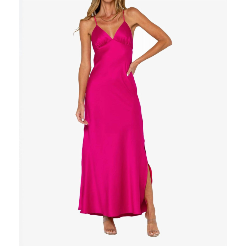 A maxi dress that is just as cute as it is comfortable.Elevate your summer wardrobe with the Savannah Dress by JBQ, a fuchsia maxi designed for women seeking relaxed elegance. This solid satin piece features spaghetti straps and a plunging V-neckline, accentuating its sophisticated appeal. Made in the USA, it highlights a draped silhouette with double side slits and a bra top detail, finished with a self-tie closure. Crafted from 100% stretch satin, this dress is best maintained through dry cleaning. Model is 5''9''.
