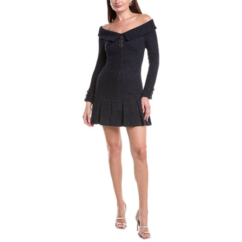 Introducing the Black Halo Edith Mini Dress, a stunning addition to your wardrobe. This dress features a unique Twilight Tapestry with Tinsel Tweed design, a Puritan collar, and a pleated hem for a modern and polished look. Made in LA, this dress is approximately 33 inches from shoulder to hem and comes with a center back zipper with hook-and-eye closure for easy wear. The shell is made of 55% Nylon, 44% Cotton, and 1% Spandex, while the lining is 96% Nylon and 4% Elastane. Dry clean only. Model is 5''10.5 and wearing a size 4. Embrace effortless style with this Black Halo dress, made in the USA.