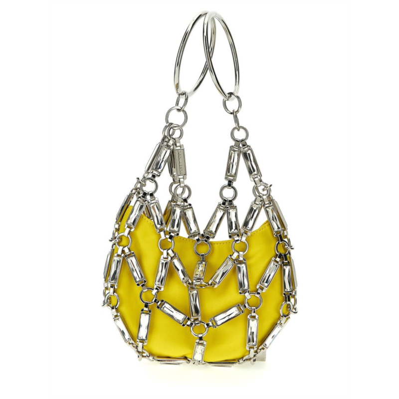 Distinctive ''Cage'' handbag by DSQUARED2 showcases a bold metallic chain design adorned with sparkling crystal accents. The vibrant yellow satin body is framed by an exquisite metal structure, creating a striking visual impact. This piece features a magnetic closure and dual handles, blending elegance with functionality.