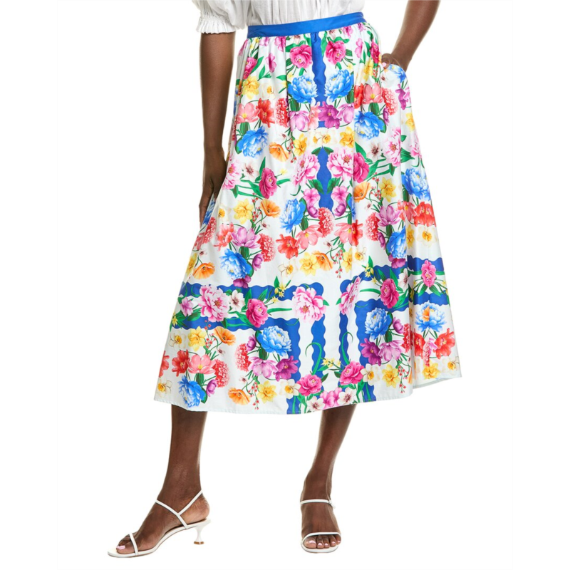 Introducing the Elie Tahari Marice Printed Skirt, a must-have addition to your wardrobe! This stunning skirt features a beautiful floral print with a pleated skirt design and two side seam pockets for added convenience. The skirt measures approximately 33 inches from waist to hem, offering a flattering silhouette. The left side zip with hook-and-eye closure ensures a secure fit. Crafted from 100% cotton, this skirt is machine washable and imported for your convenience. Elevate your look with the modern sophistication that Elie Tahari is known for in every piece.