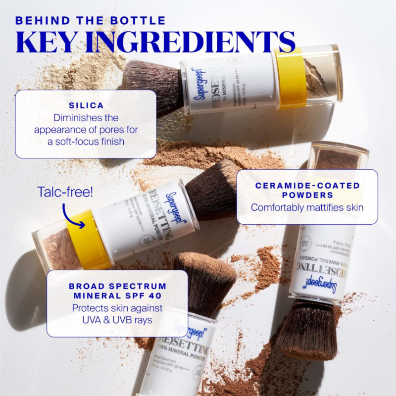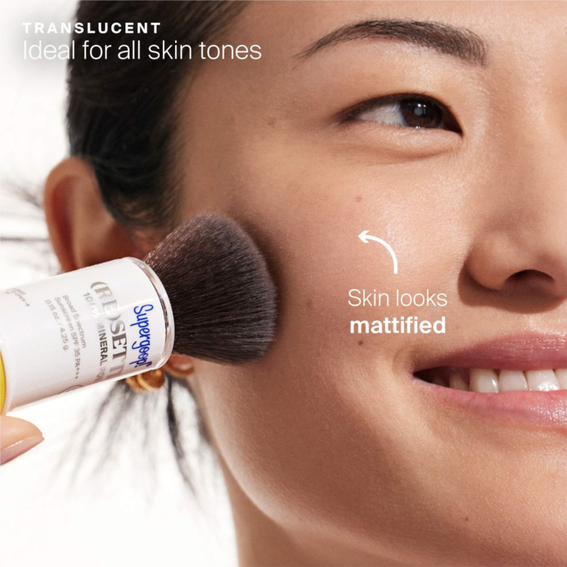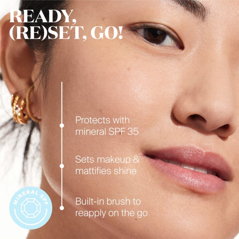 What it is: A mineral setting powder that mattifies shine, sets makeup & applies sunscreen with an easy-to-use, soft-bristled brush.