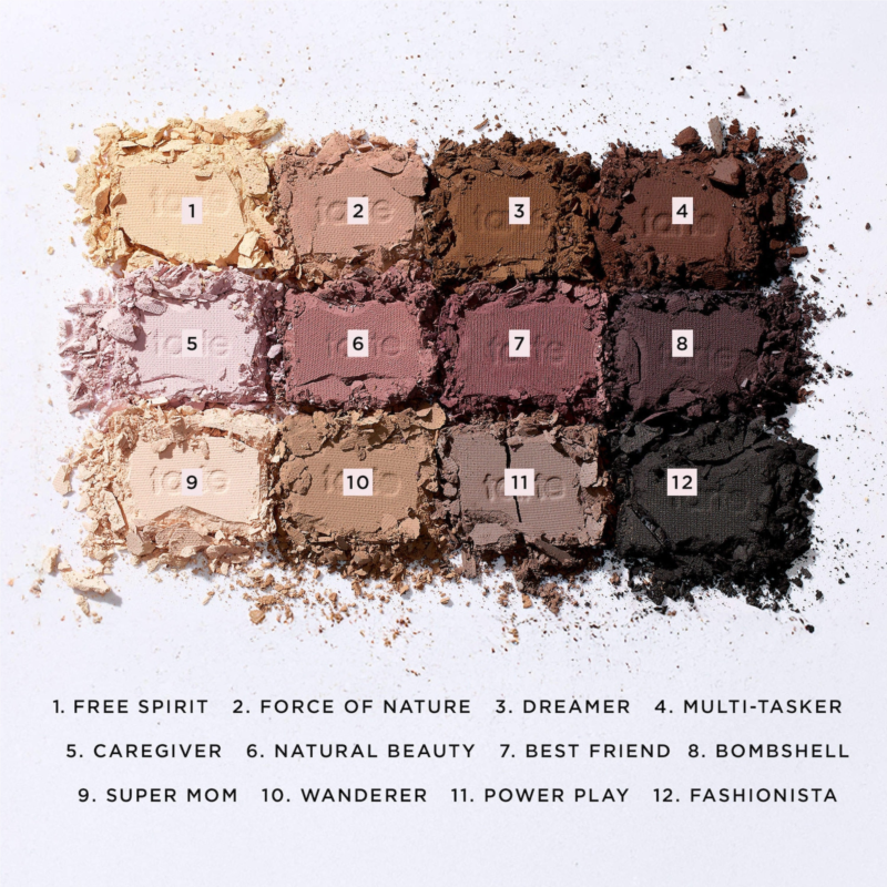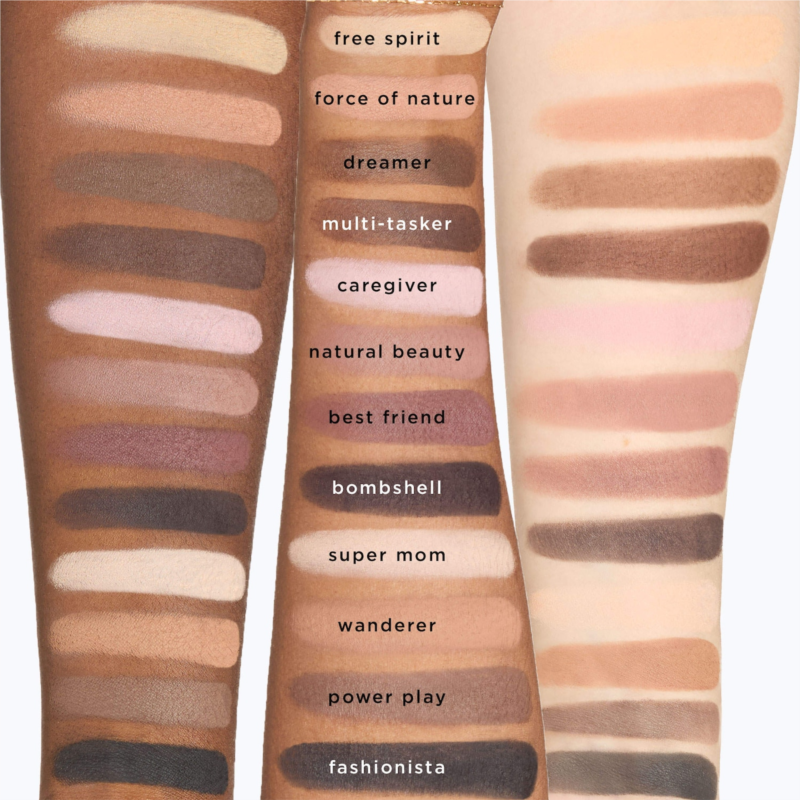 - 12 x 0.046 oz/ 1.3 g Shades in Free Spirit (cream), Force of Nature (nude), Dreamer (warm brown), Multi-Tasker (chocolate), Caregiver (pale pink), Natural Beauty (mauve), Best Friend (mulberry), Bombshell (dark plum), Super Mom (ivory), Wanderer (light brown), Power Player (taupe), Fashionista (black)