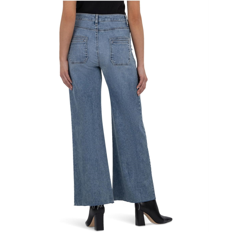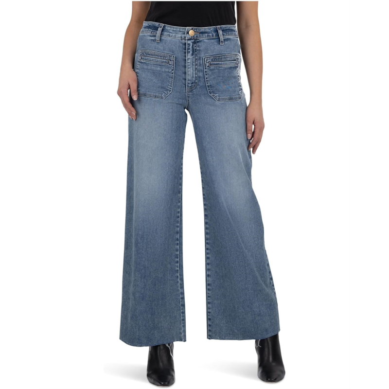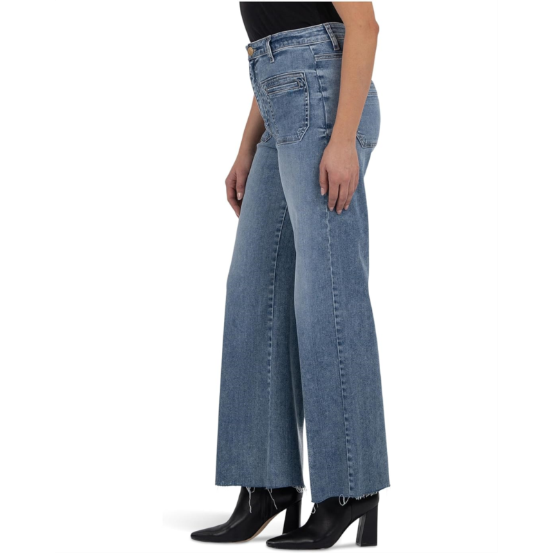 - Laid-back with the perfect amount of style and wide leg fitted through the hips, the KUT from the Kloth Meg High-Rise Wide Leg Patch Pocket jeans are fitted through the hips and thighs and finished off with an easy-tokorea wide leg for a modern take on this trending silhouette. These denim jeans are crafted from a Lyocell blend fabric that offers superior comfort and stretch. They are finished with a zip-fly, buttoned closure, and belt loops. Stylish and stretchable, these high-rise jeans are a must-have for your wardrobe.