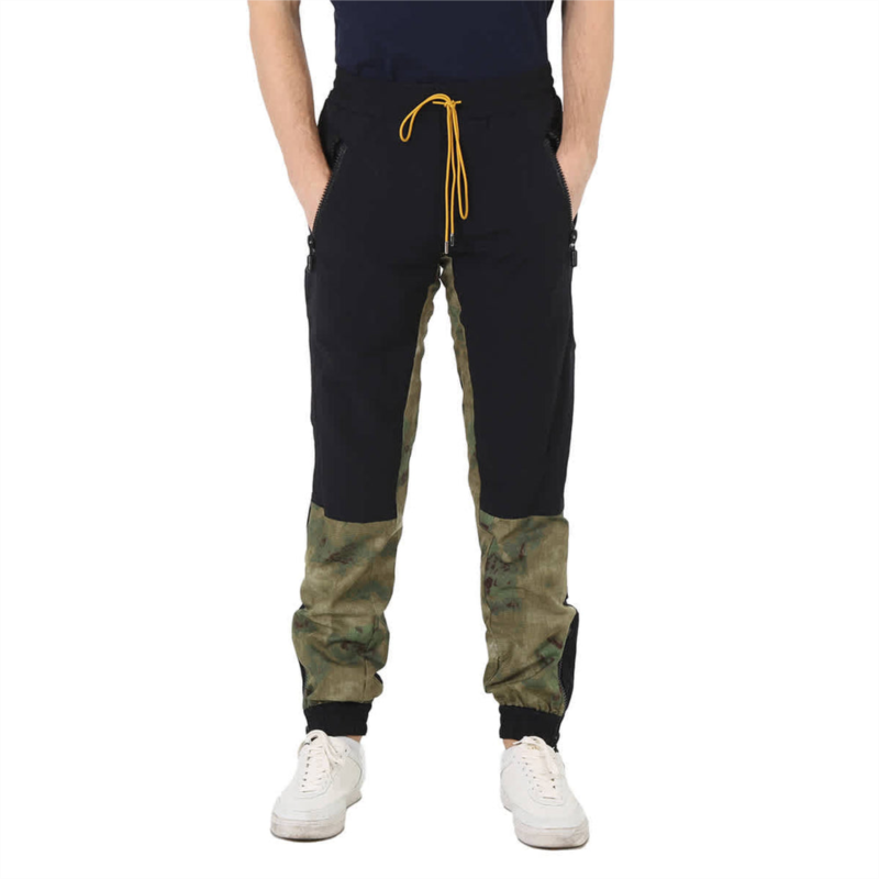 Brand - Rhude. SKU - RHU06PS20053-BLK. Color - Black/Camo. Rhude Black / Camo Nylon Jogger Pants. Rhude nyon jogger pants with technical mesh lining, enriched by camouflage inserts and elasticated waistband with the iconic contrasting drawstring. Relaxed fit, zipped side pockets, patch rear pockets, elasticated zipped cuffs. 100% nylon, 100% poliestere.