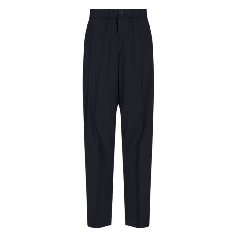 High-waisted tailored trousers designed by Giorgio Armani in deep navy. Features an elasticized waistband for added comfort and intricate pleating for a refined look. Classic straight legs enhance elegance, while a button and zip closure, along with multiple pockets, ensure practicality for today''s man.