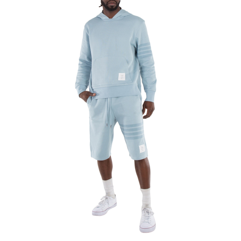 Thom Browne Men''s Bottoms. Fashion category - Shorts. SKU - MJQ161A J0051 480. Color - Light Blue. Thom Browne 4-Bar Double Face Knit Sweatshorts. These sweatshorts feature a drawstring waistband with silver-tone aglets, the brand''s iconic 4-Bar stripe detailing inspired by varsity stripes, slip side pockets, a name tag applique above the left hem, and a signature striped grosgrain loop tab. 100% Cotton. Made in Japan.
