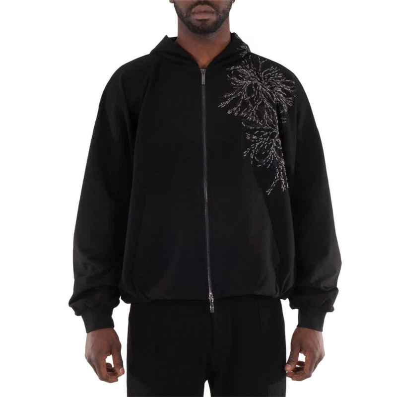 Emporio Armani Men''s Outerwear. Fashion category - Hoodies & Sweatshirts. SKU - 6D1B9S-1J8NZ-0999. Color - Black. Emporio Armani Embellished Zip-Up Jacket. Crafted with a sleek, relaxed silhouette, it features a subtle yet striking beaded floral embellishment on the shoulder and chest, adding a touch of elegance to its minimalist design. Finished with a full front zip, ribbed cuffs, and a comfortable fit, this piece effortlessly blends luxury and casual wear. Made in Italy.