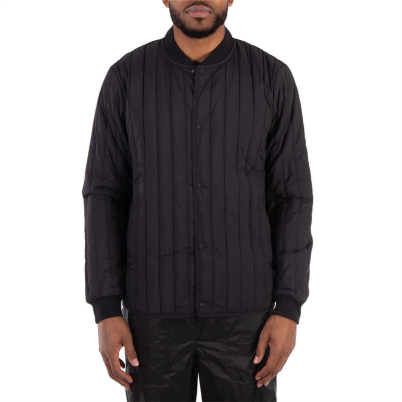Rains Men''s Outerwear. Fashion category - Coats & Jackets. SKU - 21680-BLACK. Color - Black. Rains Men''s Black Banja Liner Bomber Jacket. This sporty bomber jacket features a light midlayer and a snap button-up closure. It includes zipped side pockets, elastic bindings at the front and hem, and quilted padding for added warmth. Ribbed details, including the bomber collar and cuffs, enhance its sporty style, while the relaxed fit ensures comfort and ease of movement.