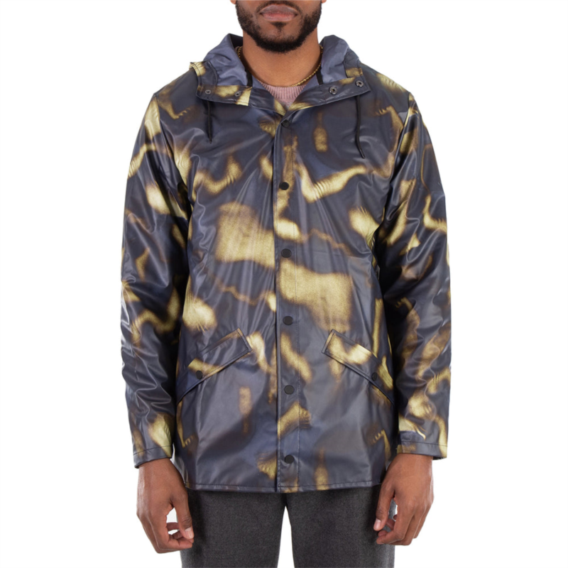 Rains Men''s Outerwear. Fashion category - Coats & Jackets. SKU - 12010-MORPH. Color - Morph. Rains Men''s Morph Rain Jacket. Cut from Rains'' signature PU fabric, this jacket features welded seams, a placket with snap fastenings for closure, and a hood with a built-in cap. It includes two side pockets with snap closures, sleeves finished with adjustable snaps for a looser or tighter fit, under-arm eyelets, and a back yoke with concealed vents for added ventilation. 100% PES (Polyester).