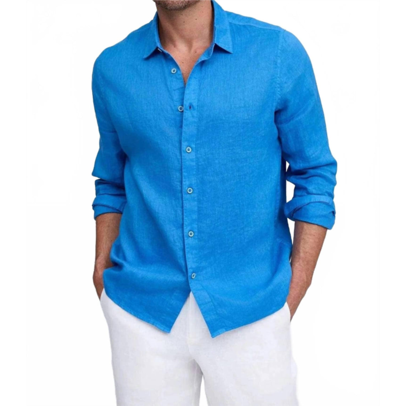 Introducing the Brayden Long Sleeve Linen Shirt by Raffi, a perfect addition to your spring wardrobe in a striking midnight hue. Crafted from 100% linen, this shirt promises lightweight breathability, making it ideal for warm weather. It features a classic collar and a convenient button closure for an effortlessly chic look. Wear it untucked for a casual vibe or pair it with tailored pants for a polished evening ensemble.