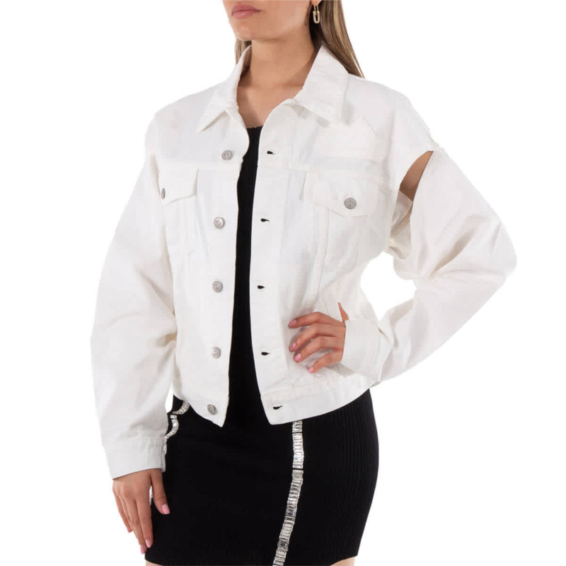 MM6 Ladies Outerwear. SKU - S52AM0141-S30653-101. Color - White. MM6 Ladies White Cut-out Detail Denim Jacket. Crafted from white denim finished with a tonal logo plaque to the chest. Featuring a classic collar, dropped shoulders, cut out details, two chest pockets, side pockets and long sleeves. ade in Italy. Main - 100% cotton, Lining - 100% cotton.