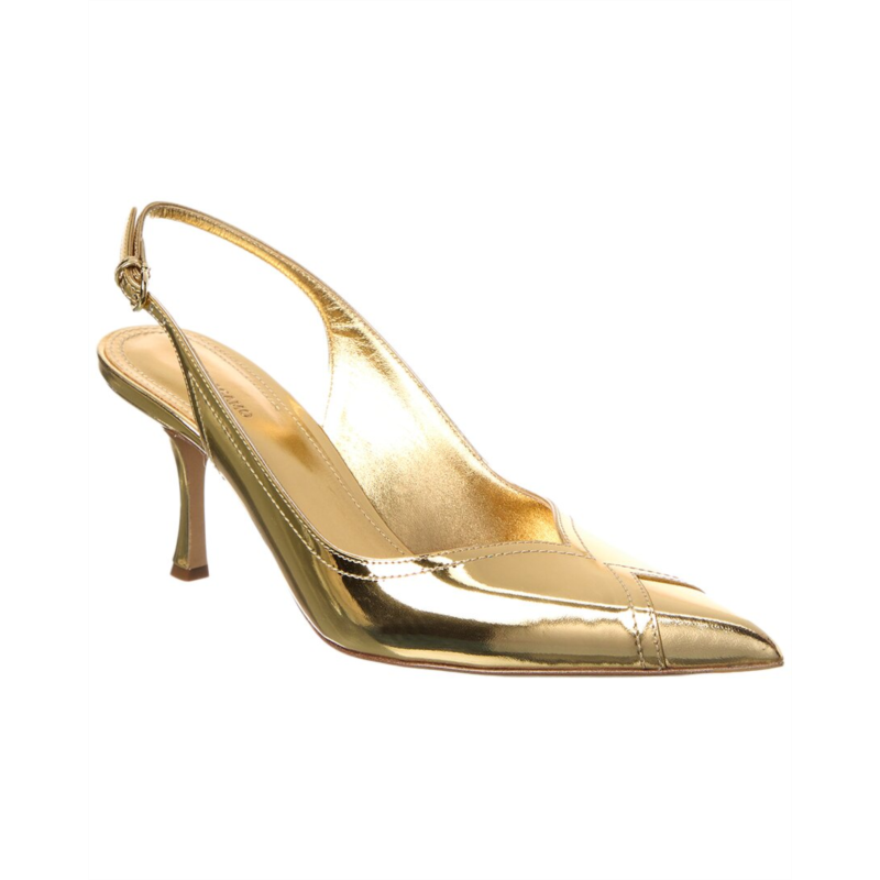 Introducing the Ferragamo Egna Leather Slingback Pump from Salvatore Ferragamo. Made in Italy, this pump features gold leather and gold-tone hardware with a Gancini buckle and patent pointy-toe for a stylish and sophisticated look. The adjustable ankle strap with buckle closure ensures a secure fit, while the lightly padded leather insole and smooth leather sole provide comfort with every step. Standing on a 3 inch heel, this pump is perfect for elevating any outfit. Please note that all measurements are approximate and were taken from a size 7C. Our products are 100% genuine, sourced from trusted independent suppliers to ensure authenticity. Make a statement with the iconic style of Ferragamo.