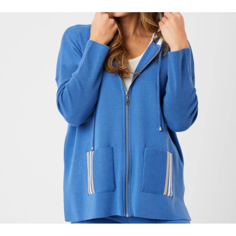 Cooler temps call for layering and we love this adorable sweatshirt for all the obvious reasons.Hooded neckline. Zip up. Stripe detail. Long sleeve. Hits at hip. Cotton/Acrylic blend. Delicate hand wash or dry clean. Imported.