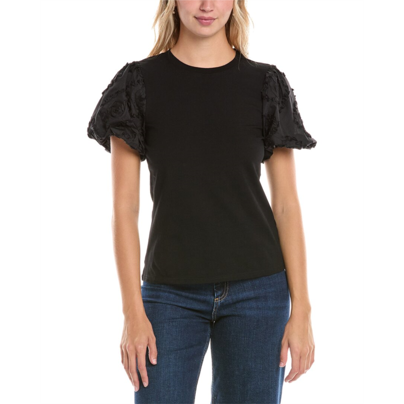 Introducing the Gracia Flower Top, a must-have addition to your wardrobe. This top features a unique and modern design, perfect for the fashion-forward woman. The black top is adorned with beautiful floral texture accents and puff sleeves, adding a touch of elegance to any outfit. Made from a blend of cotton, polyester, and spandex, this top is both comfortable and stylish. Whether you dress it up or down, this imported top is sure to turn heads. Hand wash recommended.