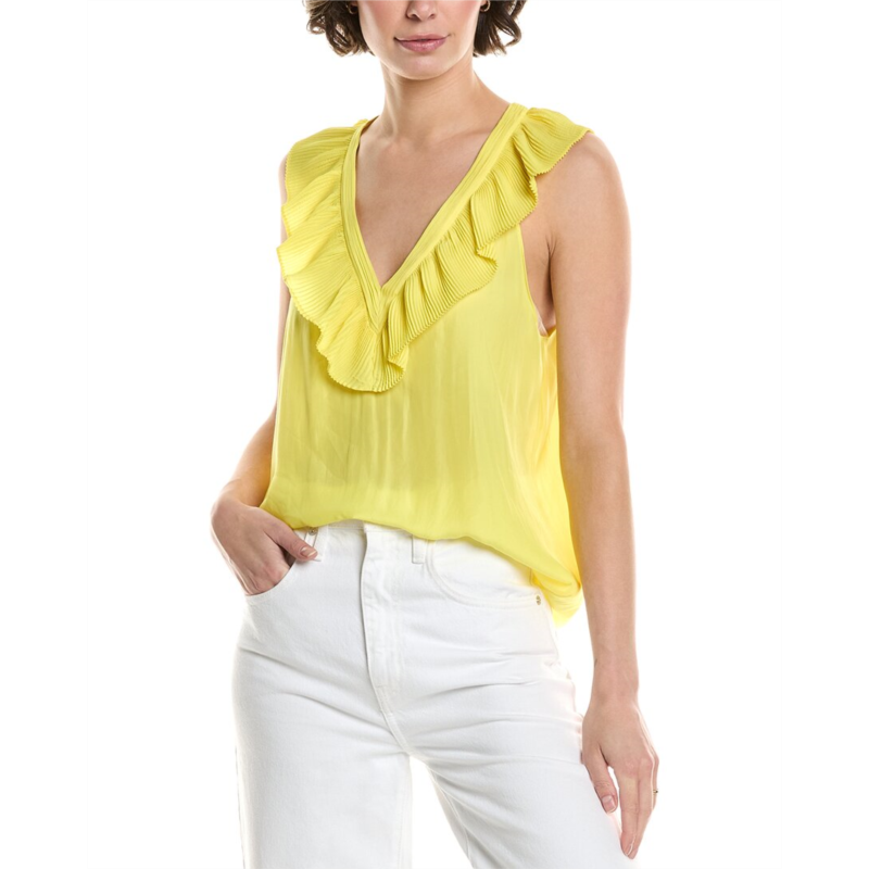 Elevate your wardrobe with the Ramy Brook Flora Top. This stunning top features a vibrant daisy print, pleated collar, and a flattering V-neck design. Made from 100% polyester, this top is both stylish and comfortable. The sophisticated silhouette and lively colors are a signature of the Ramy Brook brand, known for their use of silk fabrics and unique designs. Pair it with your favorite jeans or dress it up with a skirt for a versatile look. Hand wash recommended. Imported. Model is 5''9 and wearing a size small. Measurements may vary slightly by size.