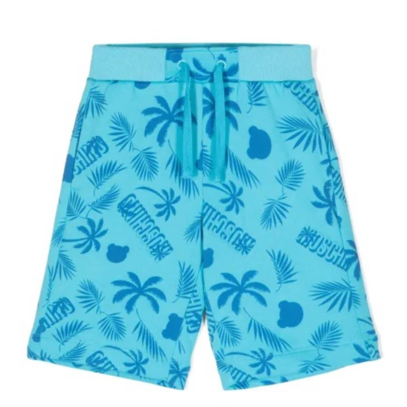 Moschino Boys Bottoms. Fashion category - Shorts. SKU - HUQ021-LCB51-85838. Color - Multicolor. Moschino Boys Palm Tree Logo Cotton Shorts. These shorts feature an elasticated drawstring waistband, two side inset pockets, and an all-over palm tree and logo print. 100% Cotton.