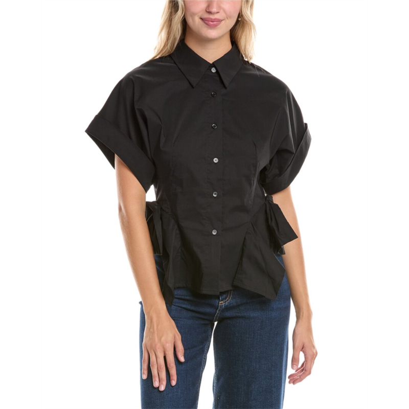 Introducing the Gracia Blouse, a stylish and sophisticated addition to your wardrobe. This black blouse features a point collar and chic bow details, creating a modern and trendy look. With a button front closure and a length of approximately 24 inches from shoulder to hem, this blouse is perfect for both casual and dressy occasions. Made of 70% cotton and 30% polyester, this blouse is not only fashionable but also comfortable to wear. Hand wash recommended. Imported. Experience the uniquely inventive designs of the Gracia brand with this elegant blouse.