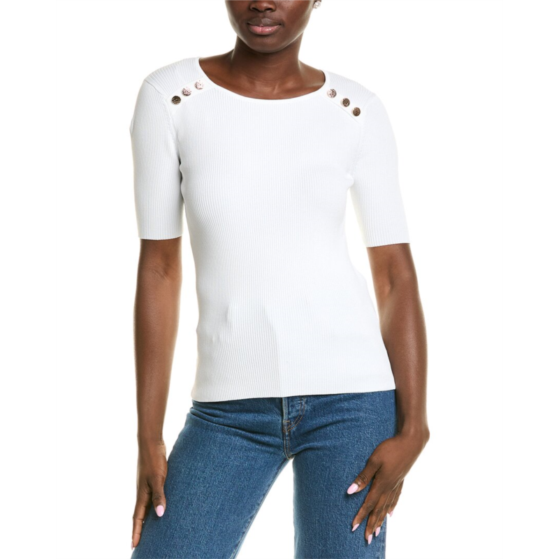 Elevate your wardrobe with the Elie Tahari Gemma Sweater, a versatile and stylish addition to your closet. Crafted with modern sophistication in mind, this pullover sweater features a chic sky white color with button accents and ribbed fabric for a touch of texture. Measuring approximately 24 inches from shoulder to hem, the Gemma Sweater offers a flattering fit that is easy to slip on. Made from a blend of 53% nylon and 47% viscose, this sweater is both comfortable and easy to care for with machine washable materials.Imported and designed by the renowned brand Elie Tahari, this sweater embodies the brand''s commitment to quality and timeless style. Add a touch of elegance to your everyday look with the Gemma Sweater from Elie Tahari.