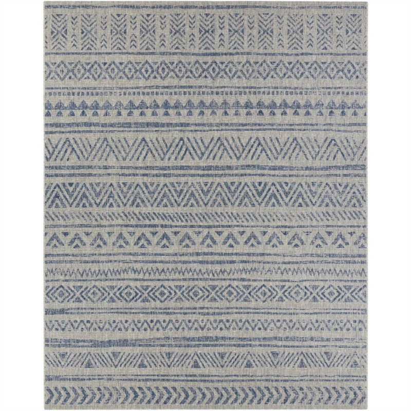 The Blue Grey Chevron Coastal Boho Style Indoor Outdoor Area Rug features geometric patterns and distressed chevron motifs that add a relaxed boho flair to any indoor or outdoor space. With its soft, weathered hues of blue and gray, it brings a breezy coastal vibe to your patio, entryway, or living room. Power-loomed in Turkey from durable, stain- and fade-resistant polypropylene, this rug is designed to stand up to heavy foot traffic. Its ultra-low 0.01'' pile height makes it an ideal option for high-use areas, both indoors and out. For extra stability and comfort, a rug pad is recommended (sold separately).