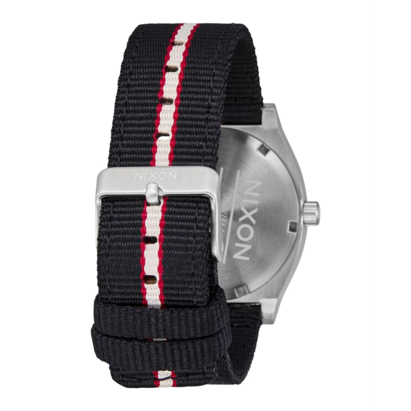 - Celebrates simple sophistication with minimalist design wearing the Nixon Time Teller Nylon watch. The watch is designed with 100m /10 ATM waterproof rating to keep you worry-free when wet. Nylon strap with sliding buckle provides secure fit while Miyota Japanese quartz 3 hand movement has molded hands. A sunray dial with raised indices keeps you updated for your routine activities.