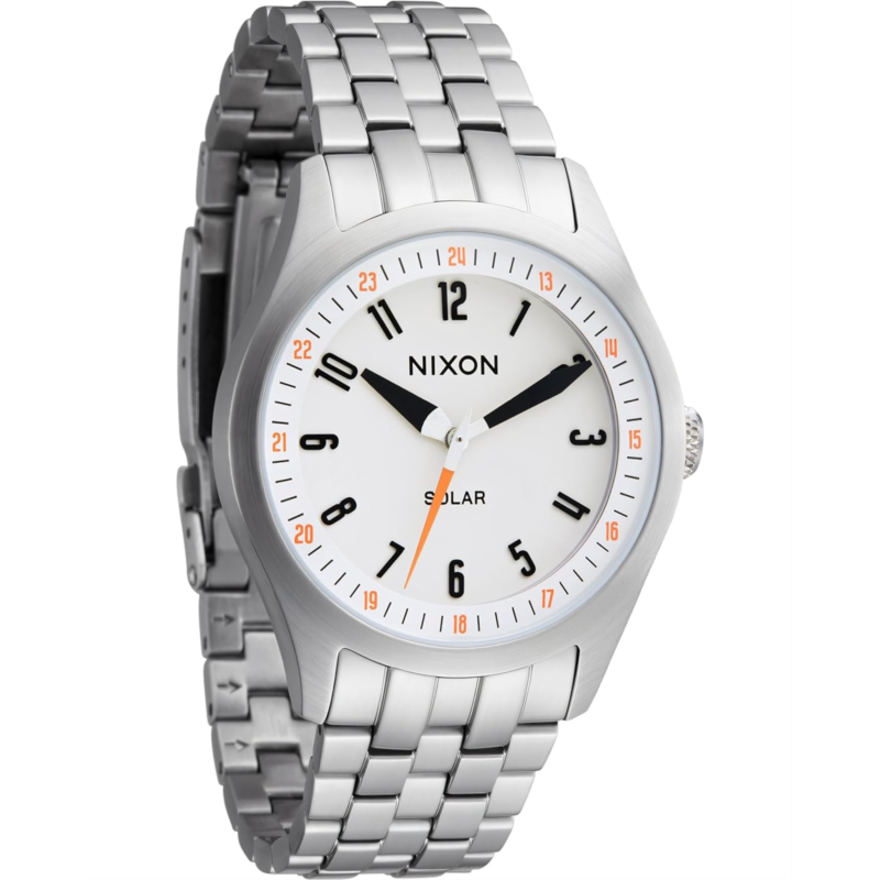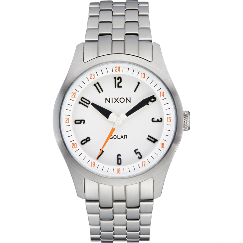- Built to last, styled for life wearing Nixon Scout NATO. This solar-powered timepiece boasts a sleek stainless steel case and integrated band, ideal for everyday wear. Featuring a solar-powered Miyota movement, it runs up to 4 months on a single charge, eliminating the hassle of battery changes. Enjoy effortless readability with luminous bold hands and Arabic numerals, perfect for low-light conditions. The stadium ring above the dial enhances visibility, while the quick-release stainless steel strap offers convenience. Built to endure, it combines durability with functionality, making it your go-to choice.