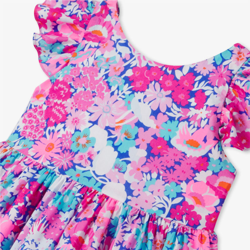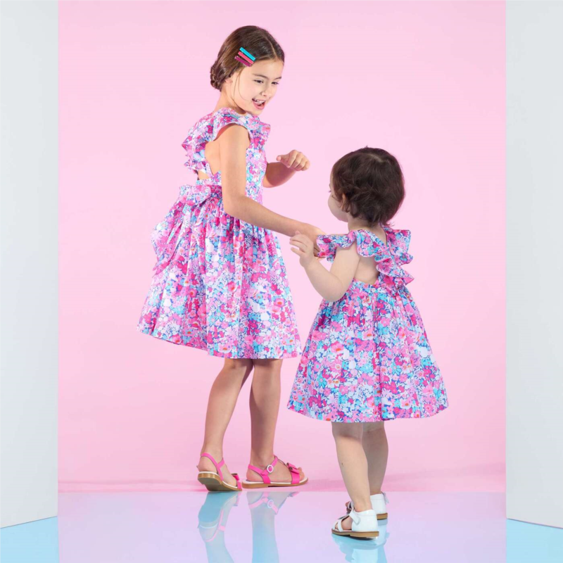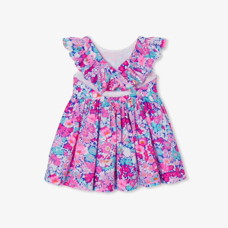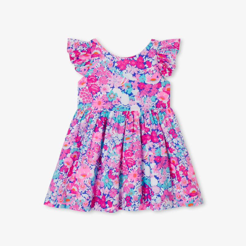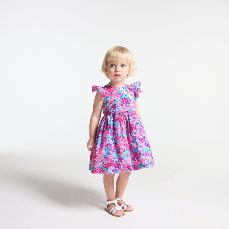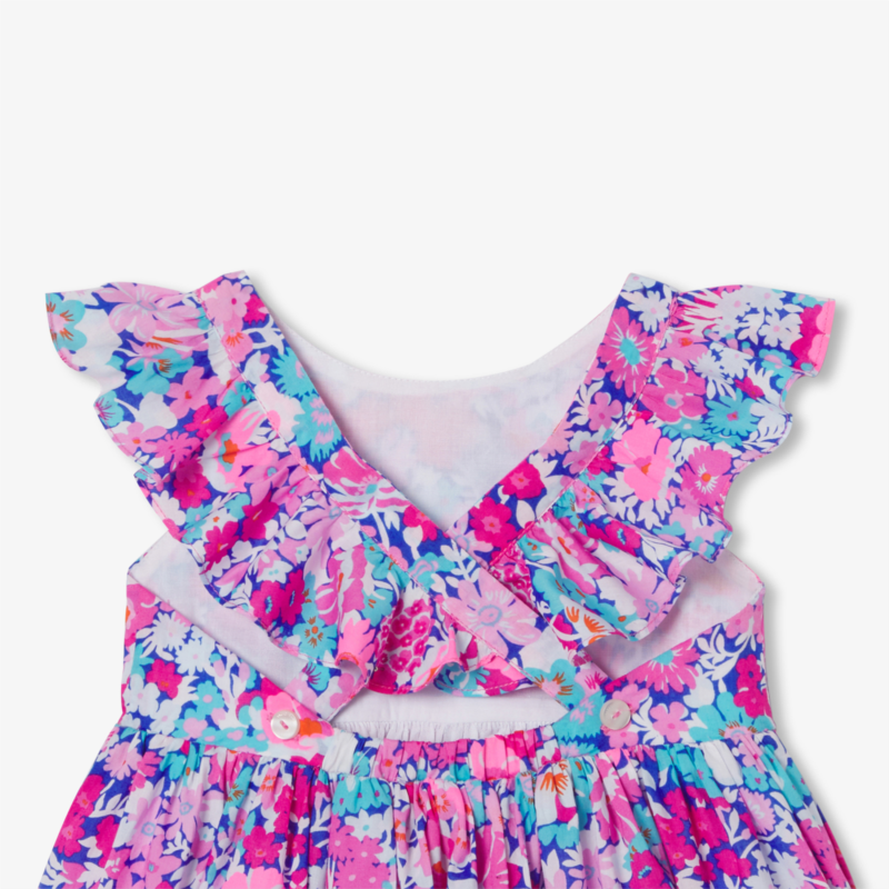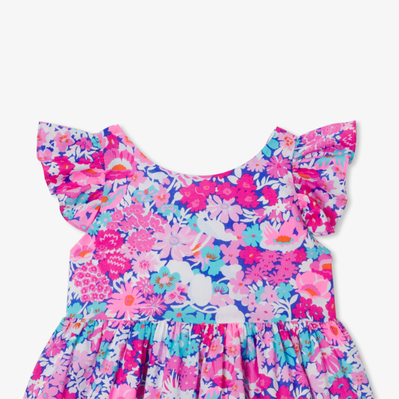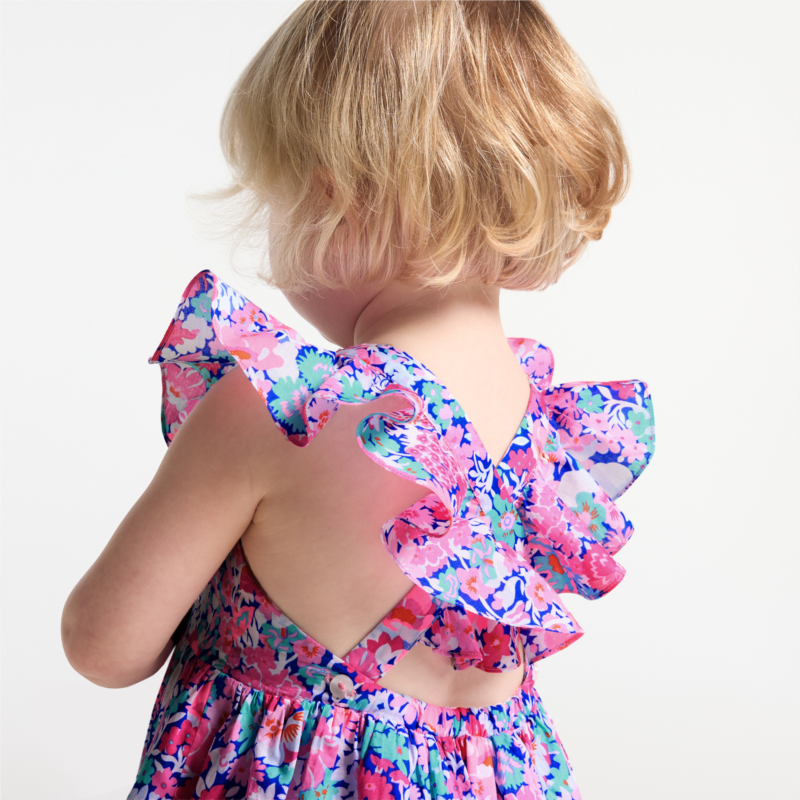 This summer, Jacadi invites little girls into a bright floral universe with this baby girl dress. In Liberty fabric, ruffled sleeves, croszed back straps and small pleats at the waist complete this piece with geometric volume to be worn with coordinating accessories for a ceremony and every day afterwards.