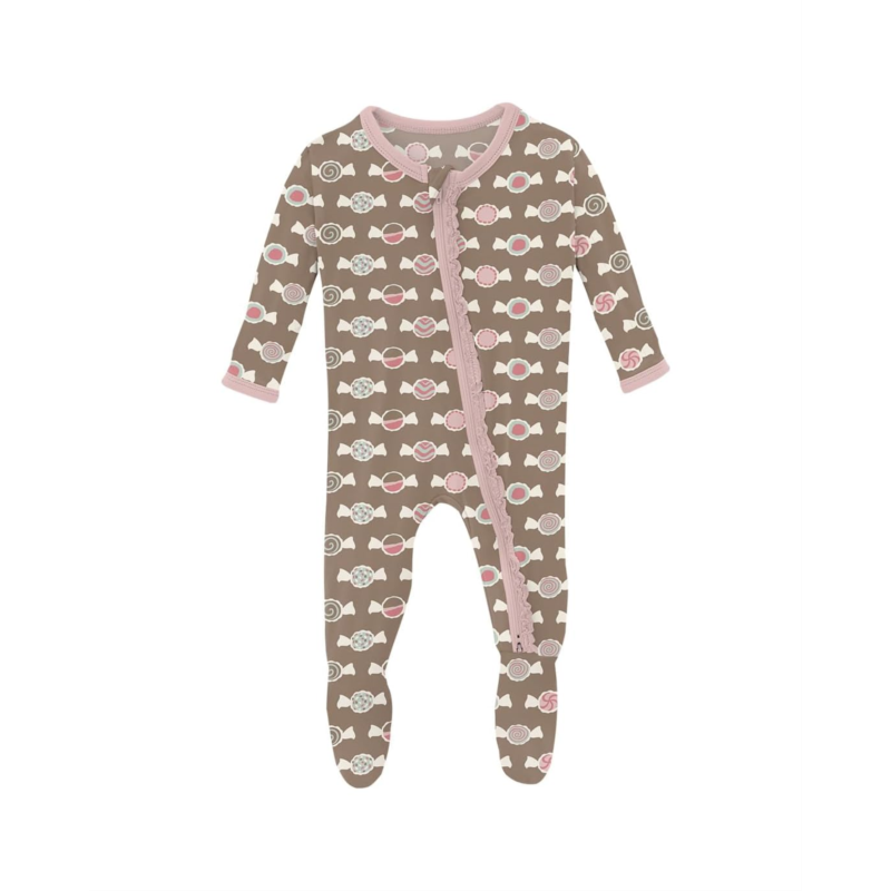 - The Kickee Pants Kids Print Muffin Ruffle Footie with 2 Way Zipper is designed to wrap your little one in buttery-soft goodness. Cozy with adorable ruffles, this kid''s bodysuit has flip paws to cover chilly hands and prevent scratching, fleece on the inside feet, and no-slip grips on the outside feet. It is made from super soft, breathable, and tag-free signature blend fabric that is perfect for sensitive skin. The zippered front closure makes for easy changes, and it''s topped with a zipper guard so it won''t accidentally pinch the skin. This printed bodysuit is designed to be a snug fit so that it is safe to sleep in and meets all CPSC safety standards. It comes with long sleeves and a crew neckline. Comfortable and stylish, this footie is a smart garment choice for keeping babies and kids warm while allowing for movement.