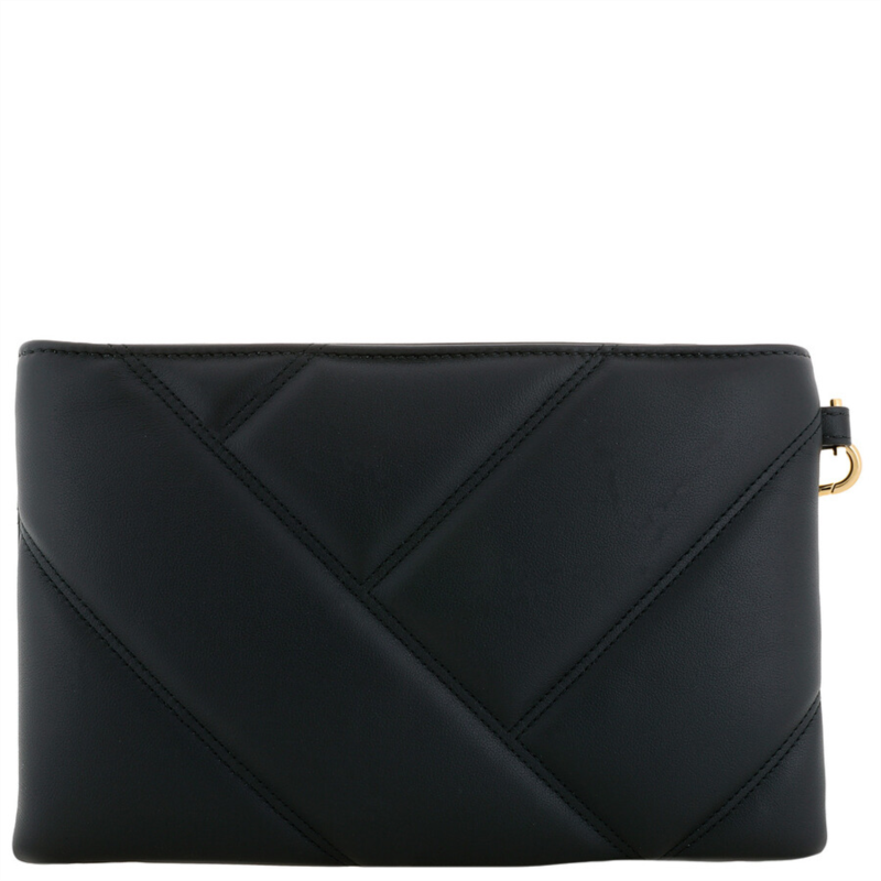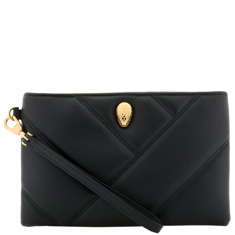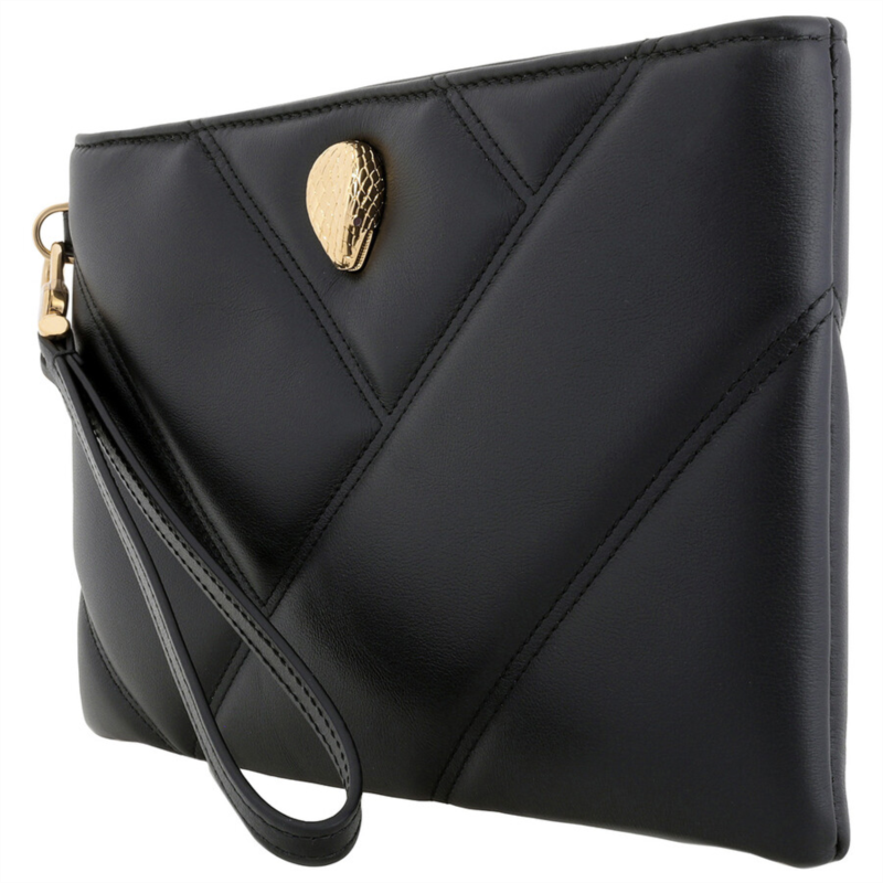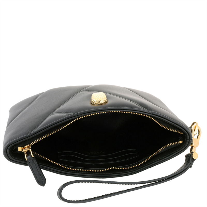Bvlgari Ladies Clutch. Serpenti series. SKU: 293926. Color: Black. Bvlgari Serpenti Cabochon Clutch. Crafted from soft black calf leather with a geometric maxi matelasse pattern inspired by cabochon-cut gemstones, this versatile clutch features the iconic heritage snakehead rivet inspired by 1960s Bvlgari watches. Designed to be worn as a clutch or used inside a larger bag, it includes a leather wristlet, zip closure, a single compartment, and two credit card slots. Dimensions: 22 x 14.5 x 1.5 cm (8.7 x 5.7 x 0.6 in). Material: Calf leather & nappa leather lining. Made in Italy.