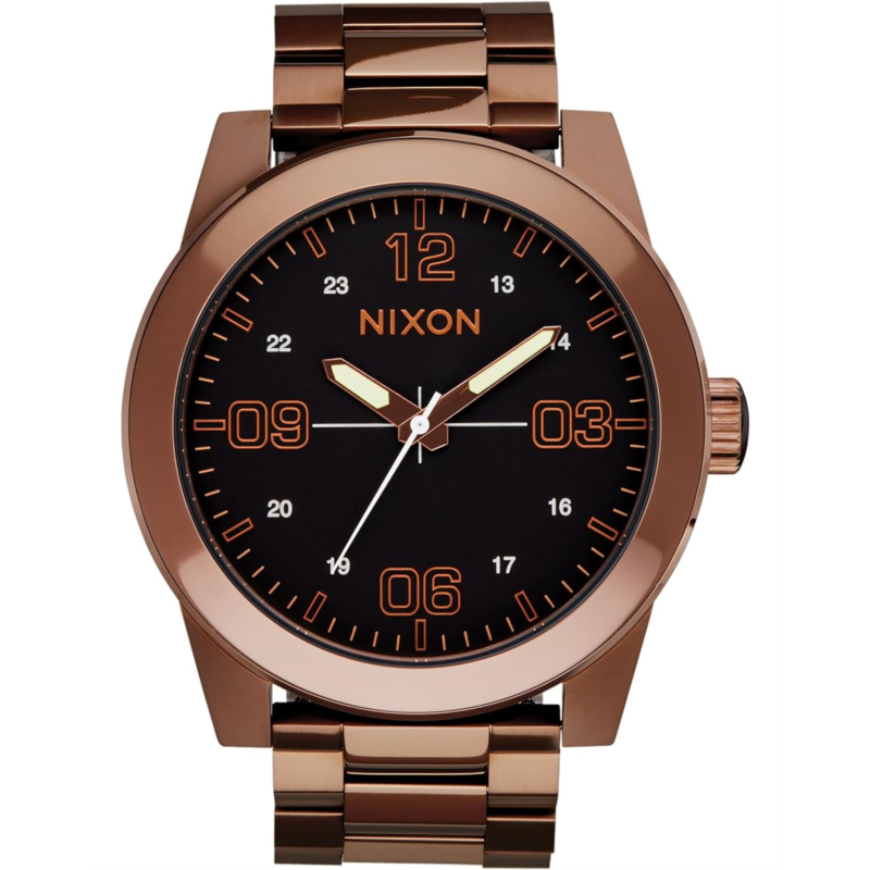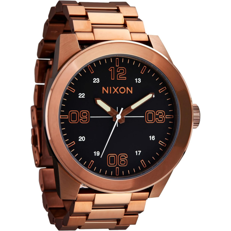 - The Nixon Corporal Stainless Steel watch with a clear, tactical advantage. The face is protected by a recessed crystal and the oversized bezel brings out the best in rugged durability. It''s functional design combined with details like faceted links that look like a mountain range when viewed from the side means the Corporal always has the high ground. The stainless steel watch feature Miyota Japanese Quartz three-hand and double locking foldover clasp closure.