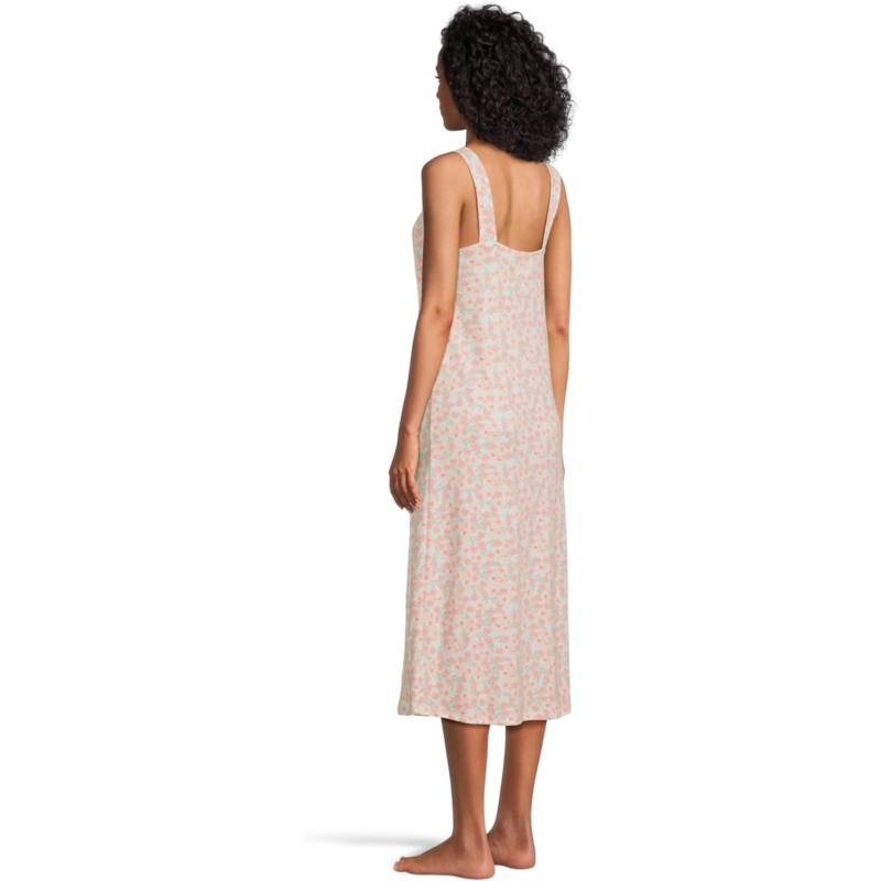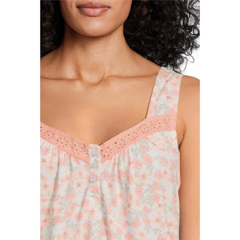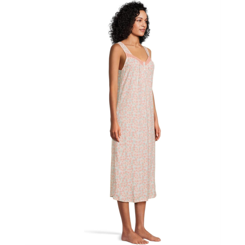 Lounge around in luxurious comfort wearing Karen Neuburger Midi Henley Chemise With Eyelet Inserts. The pull-on style sleeveless dress features a sweetheart neckline with fashionable eyelet details, a quarter-button closure, an allover floral print, and a flattering midi-length silhouette.