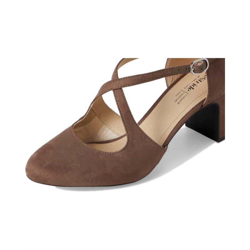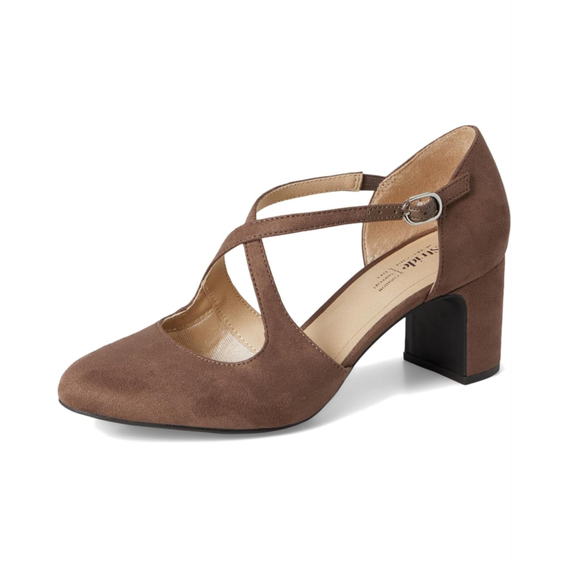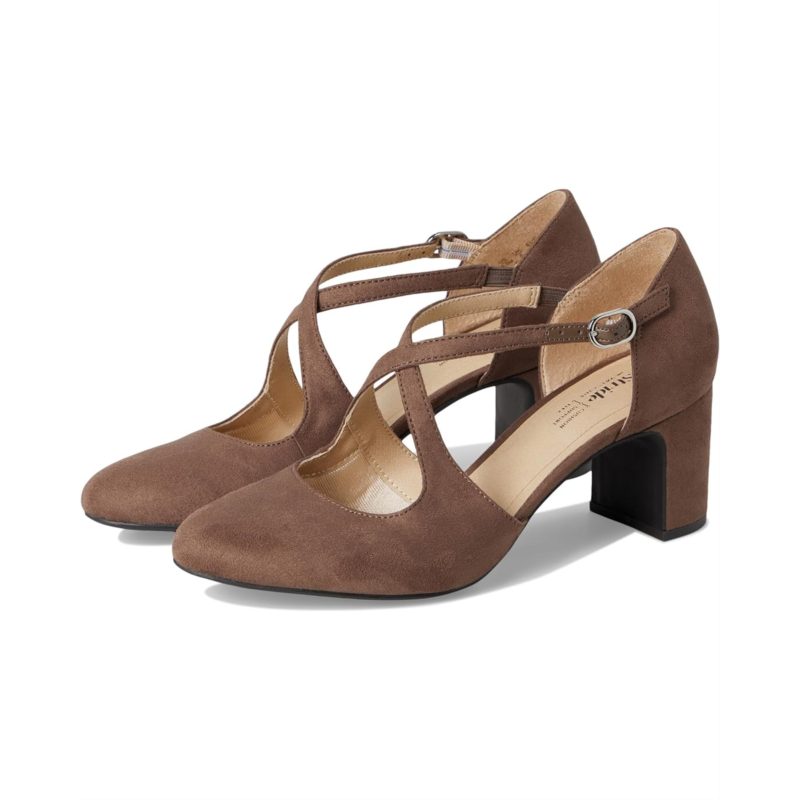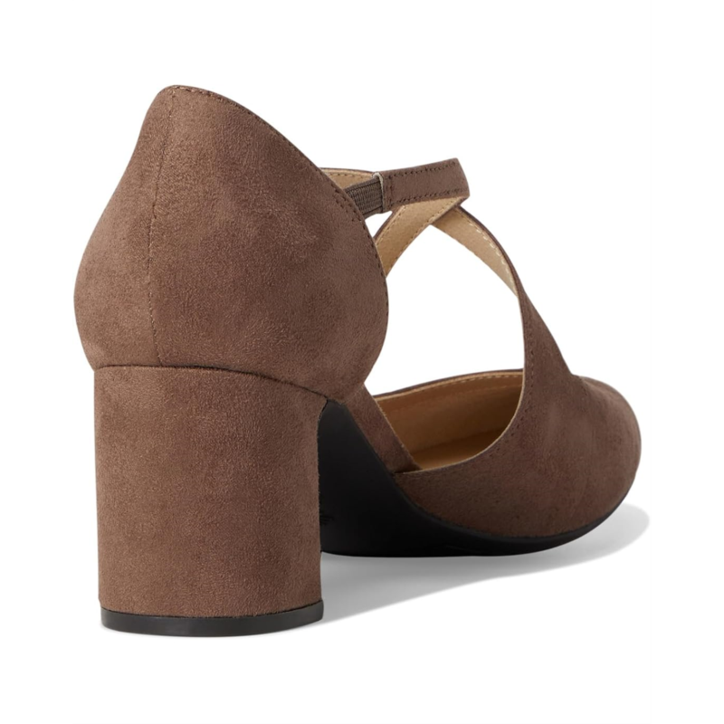 Stay chic on your feet in this Tracy, retro-inspired block heel pump. Featuring a faux leather or microfiber upper with an almond toe, adjustable buckle, cupped heel, and strappy design.